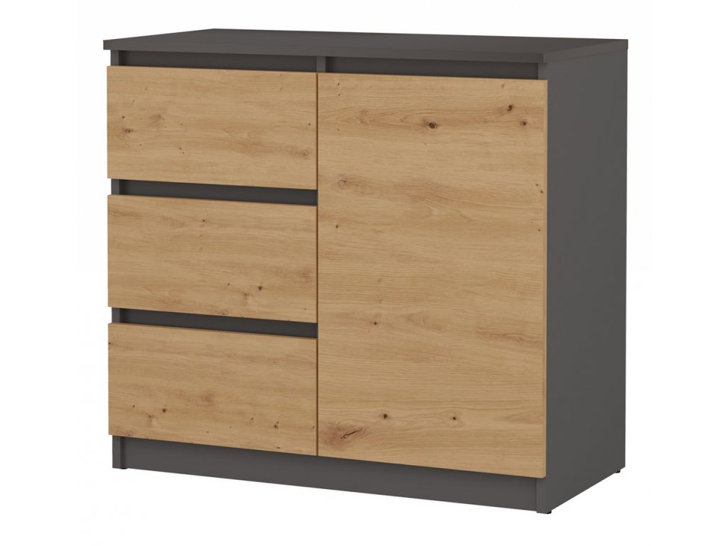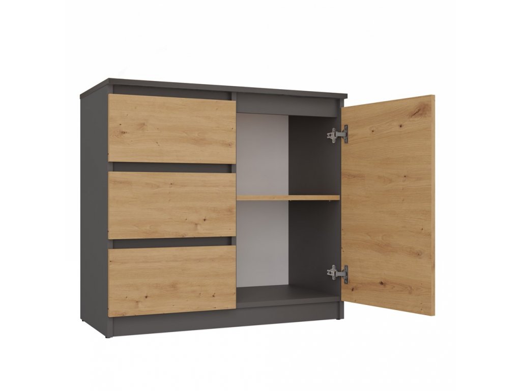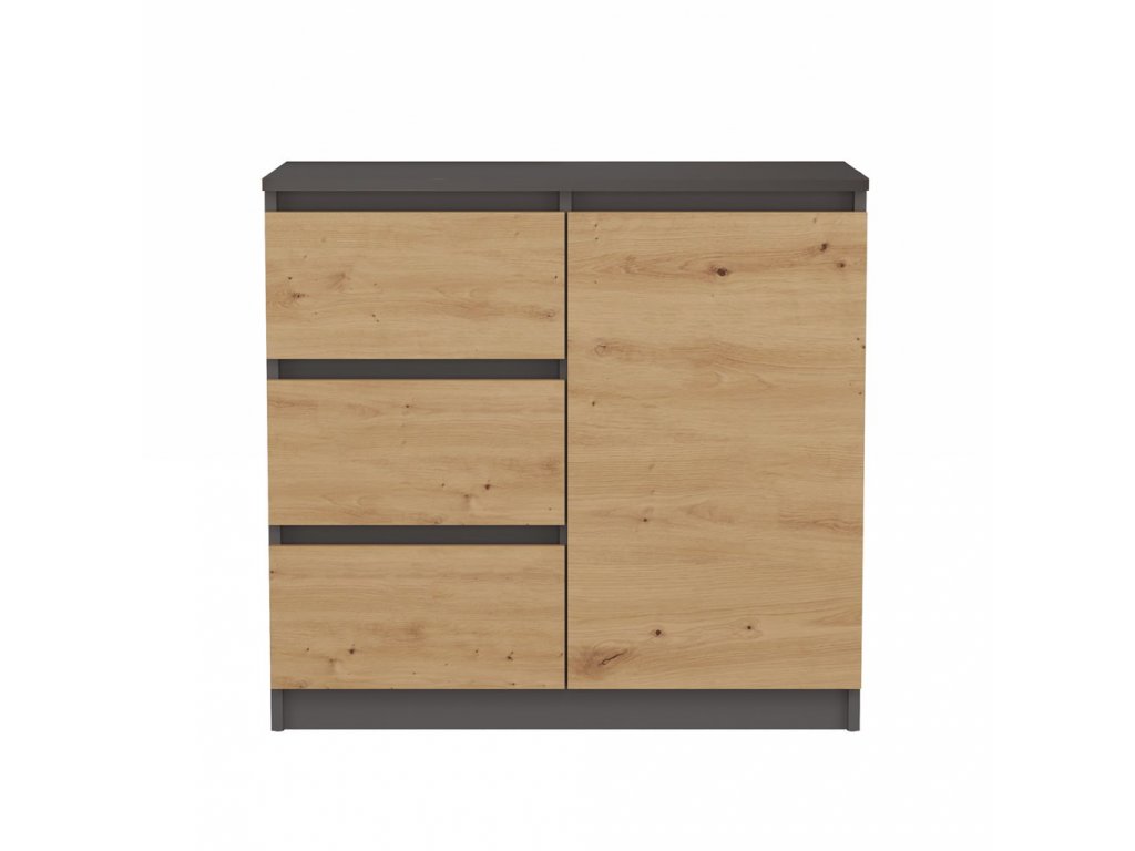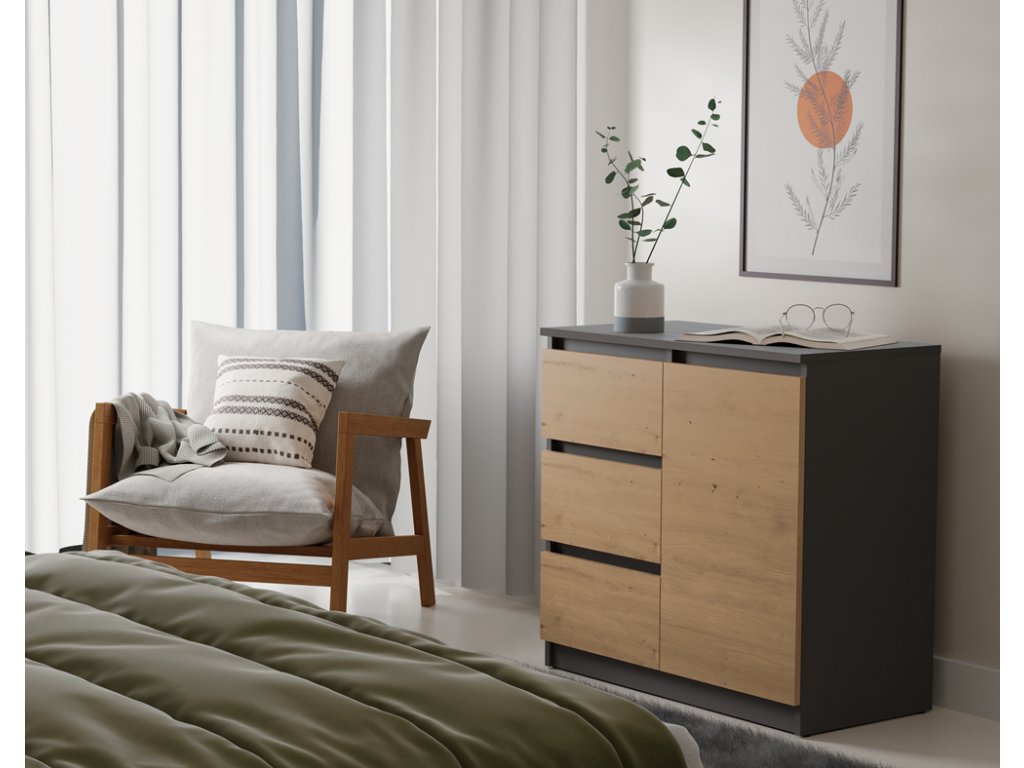 Moderní komoda, která se skvěle hodí do ložnice, obývacího nebo dětského pokoje. Její univerzální vzhled splňuje očekávání těch, kteří ocení spojení jednoduchosti a elegance. Vnitřek komody se skládá z police a tří šuplíků, které vám pomohou s uspořádáním vašich věcí. Minimalistická konstrukce a šuplíky bez madel dodávají komodě moderní vzhled. Vyrobeno z kvalitní LTD desky, která má tloušťku 16 mm a je nenáročná na údržbu. Dodáváme v demontu.