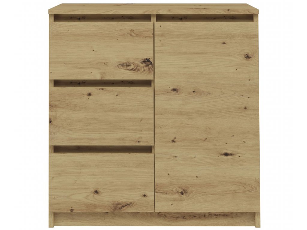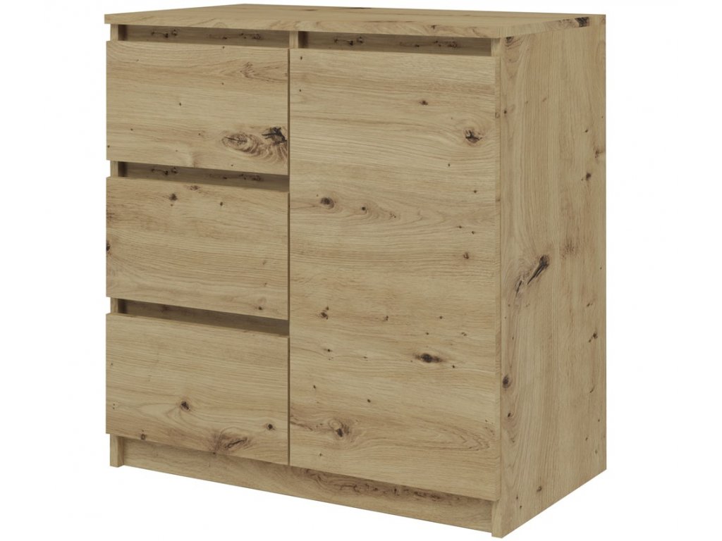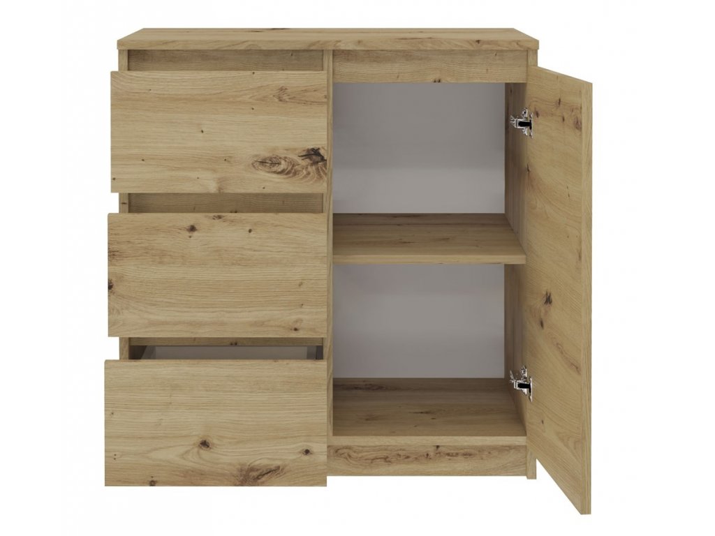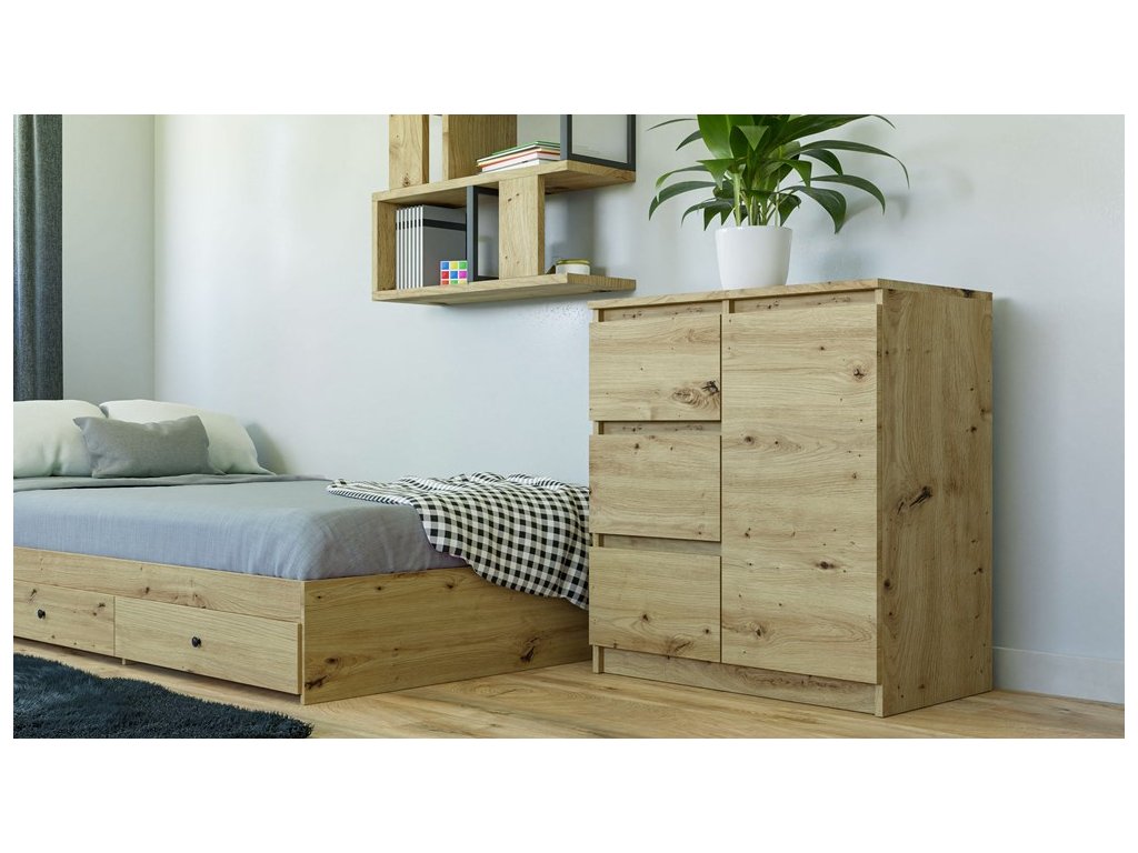 Moderní komoda, která se skvěle hodí do ložnice, obývacího nebo dětského pokoje. Její univerzální vzhled splňuje očekávání těch, kteří ocení spojení jednoduchosti a elegance. Vnitřek komody se skládá ze dvou polic a tří šuplíků, které vám pomohou s uspořádáním vašich věcí. Minimalistická konstrukce a šuplíky bez madel dodávají komodě moderní vzhled. Vyrobeno z kvalitní LTD desky, která má tloušťku 16 mm a je nenáročná na údržbu. Dodáváme v demontu.