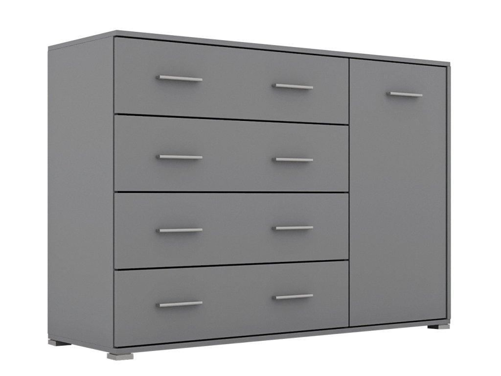 Komoda jednodveřová se čtyřmi zásuvkami je vyrobená z kvalitní laminátové desky (odolné a ekologicky šetrné) v barevném provedení šedá. Kvalitní pojezdy zajišťují hladký a tichý pohyb zásuvek. Dodáváme v demontovaném stavu.Doplňkové parametry