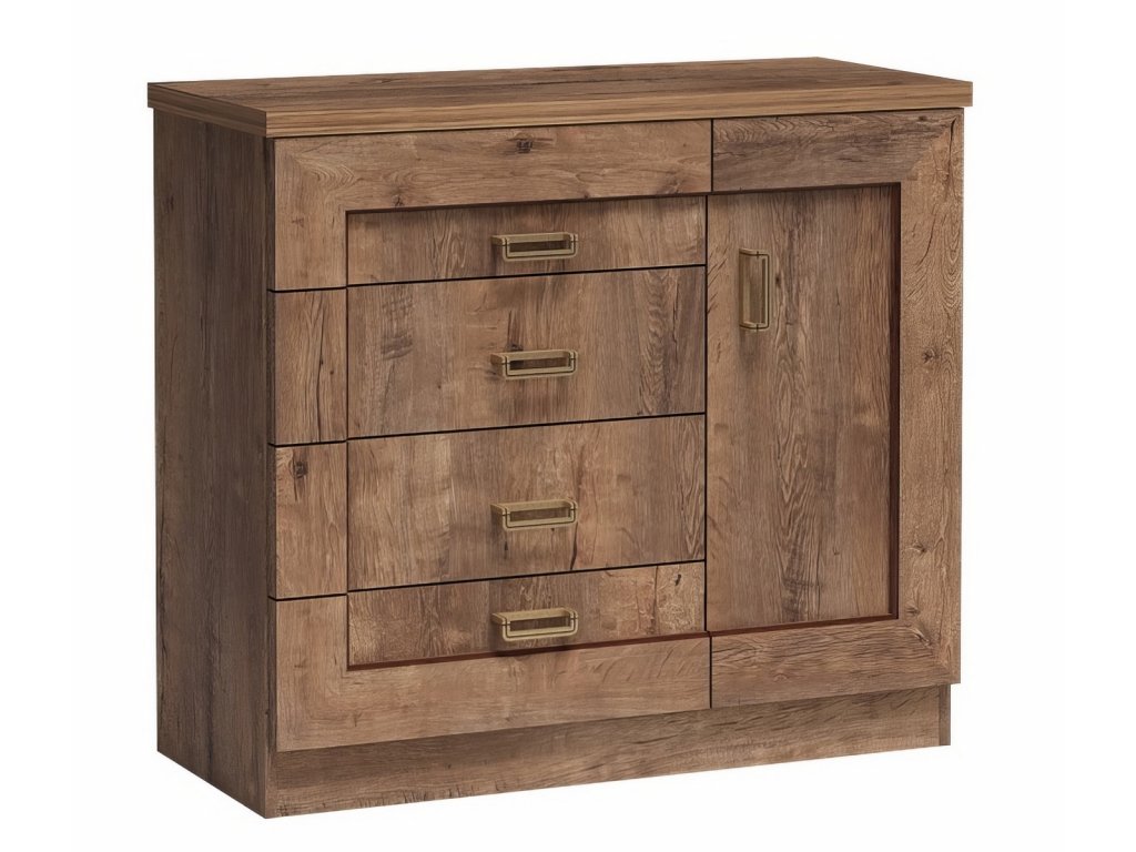 Komoda jednodveřová se 4 zásuvkami ze sektorové řady. Komoda má 1 dvířka a 4 praktické zásuvky, za dvířky je 1 police. Systém je exkluzivní kolekce navržena v duchu vintage. Celá řada se vyznačuje elegancí a jednoduchými tvary, které zaručují plné využití prostoru. Nábytek je vyroben z velmi kvalitní LTD o tloušťce 16 mm, horní deska zesílena na 32 mm, lišty na čele nábytku jsou MDF, hrany ABS. Tvrzené sklo ve vitrínách je jemně zdobené. Elegantní úchyty jsou z kovu. Barevné provedení dub lefkas. Dodáváme v demontovaném stavu.Doplňkové parametry