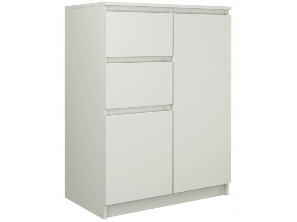 Moderní komoda, která se skvěle hodí do ložnice, obývacího nebo dětského pokoje. Její univerzální vzhled splňuje očekávání těch, kteří ocení spojení jednoduchosti a elegance. Vnitřek komody obsahuje dva šuplíky a dvě police, které vám pomohou s uspořádáním vašich věcí. Minimalistická konstrukce a šuplíky bez madel dodávají komodě moderní vzhled. Vyrobeno z kvalitní LTD desky, která má tloušťku 16 mm a je nenáročná na údržbu. Dodáváme v demontu.