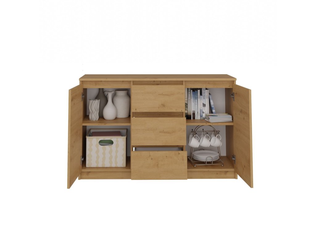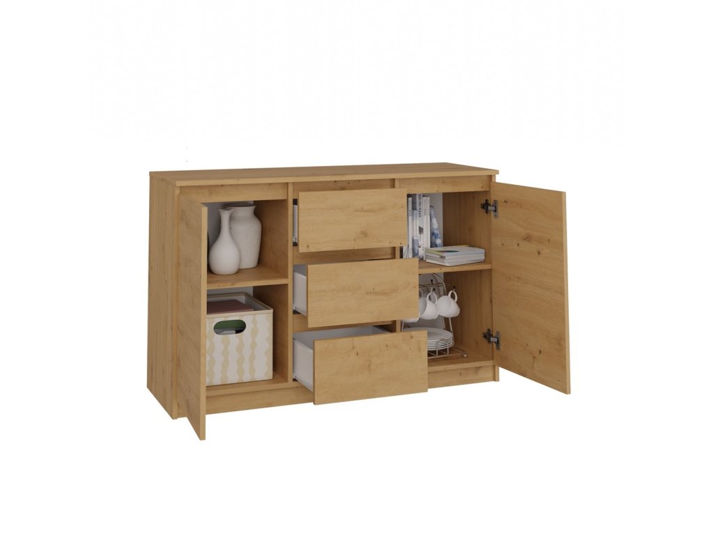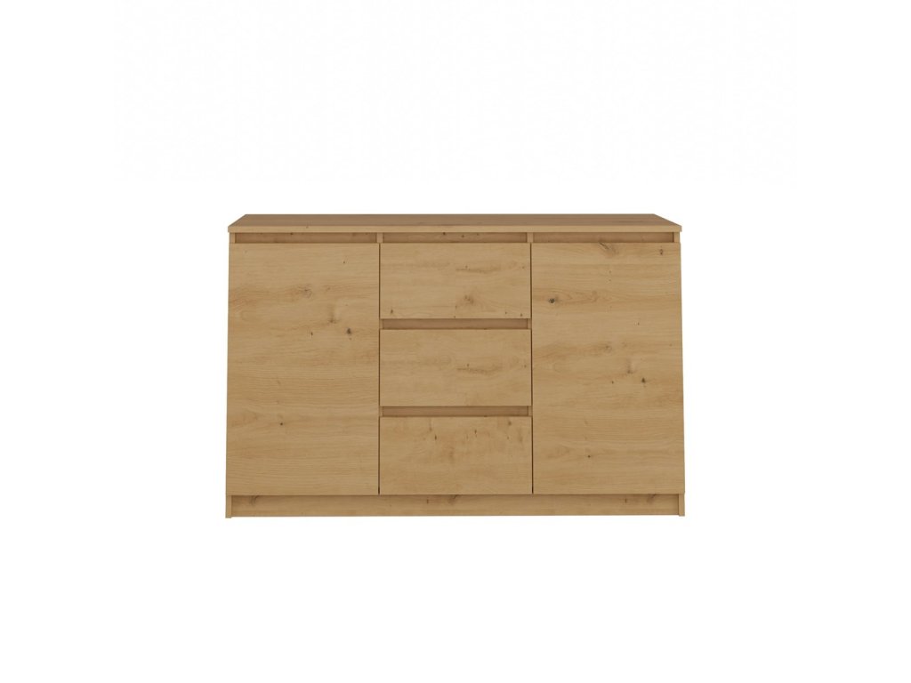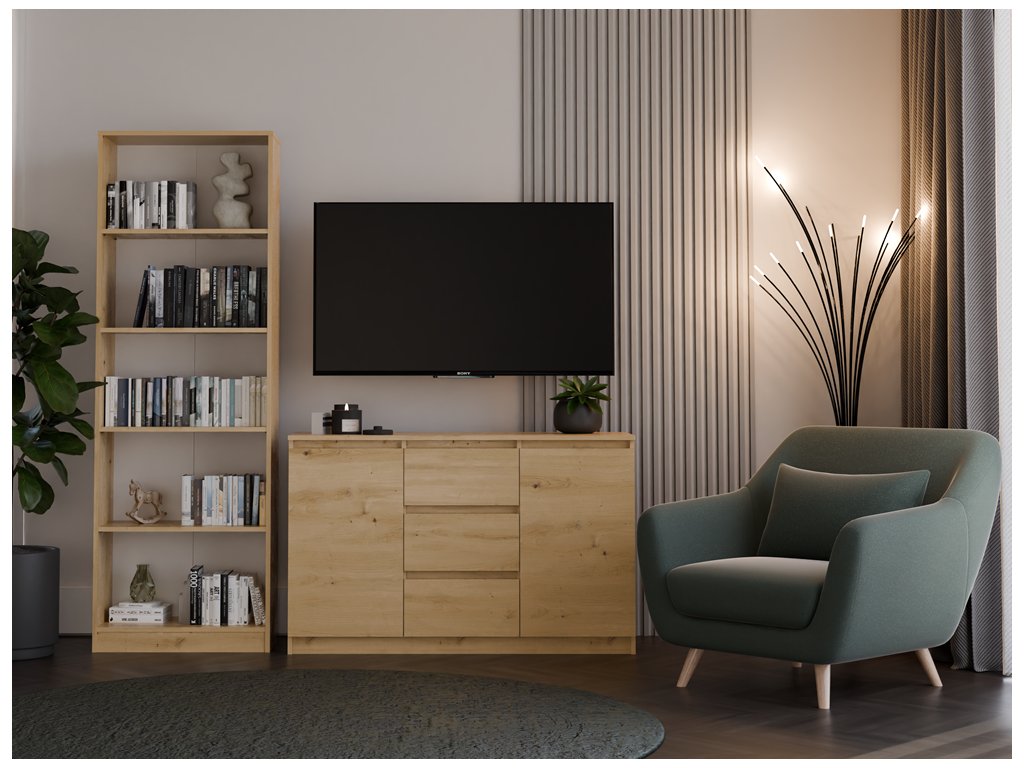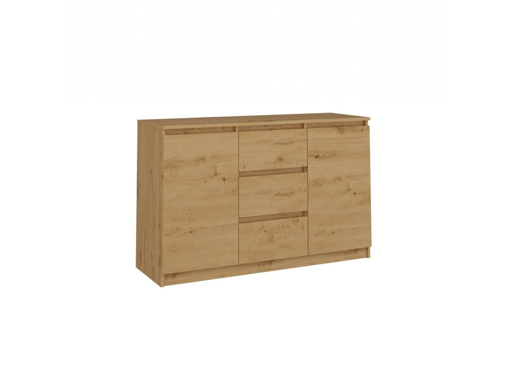 Moderní komoda, která se skvěle hodí do ložnice, obývacího nebo dětského pokoje. Její univerzální vzhled splňuje očekávání těch, kteří ocení spojení jednoduchosti a elegance. Vnitřek komody obsahuje tři šuplíky a dvě police, které vám pomohou s uspořádáním vašich věcí. Minimalistická konstrukce a šuplíky bez madel dodávají komodě moderní vzhled. Vyrobeno z kvalitní LTD desky, která má tloušťku 16 mm a je nenáročná na údržbu. Dodáváme v demontu.