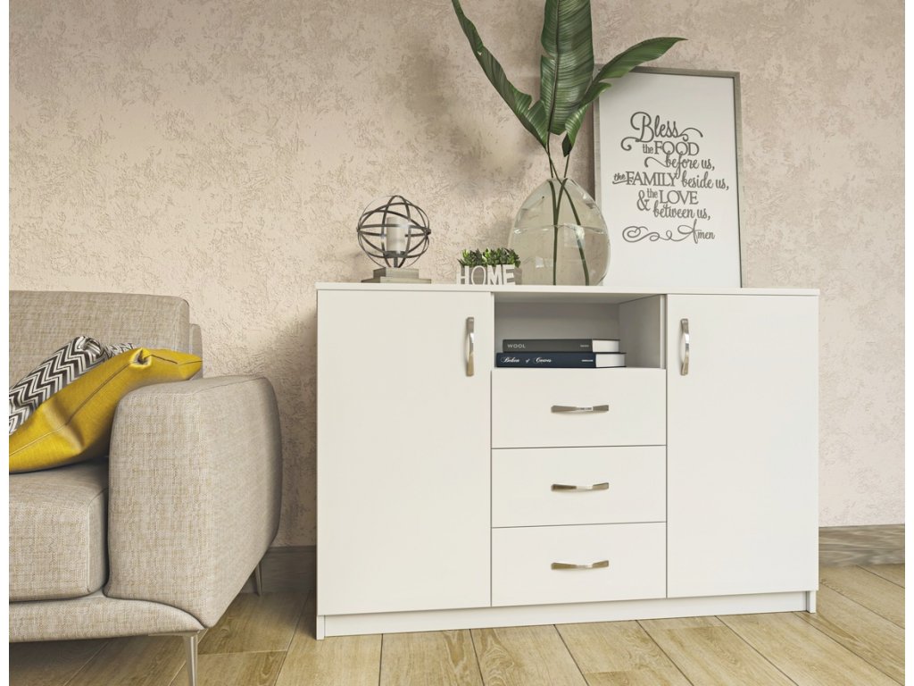 Komoda dvoudveřová se třemi zásuvkami je vyrobená z kvalitní laminátové desky v barevném provedení bílá (NImfea alba). Úchyty jsou kovové. Dodáváme v demontovaném stavu.Doplňkové parametry