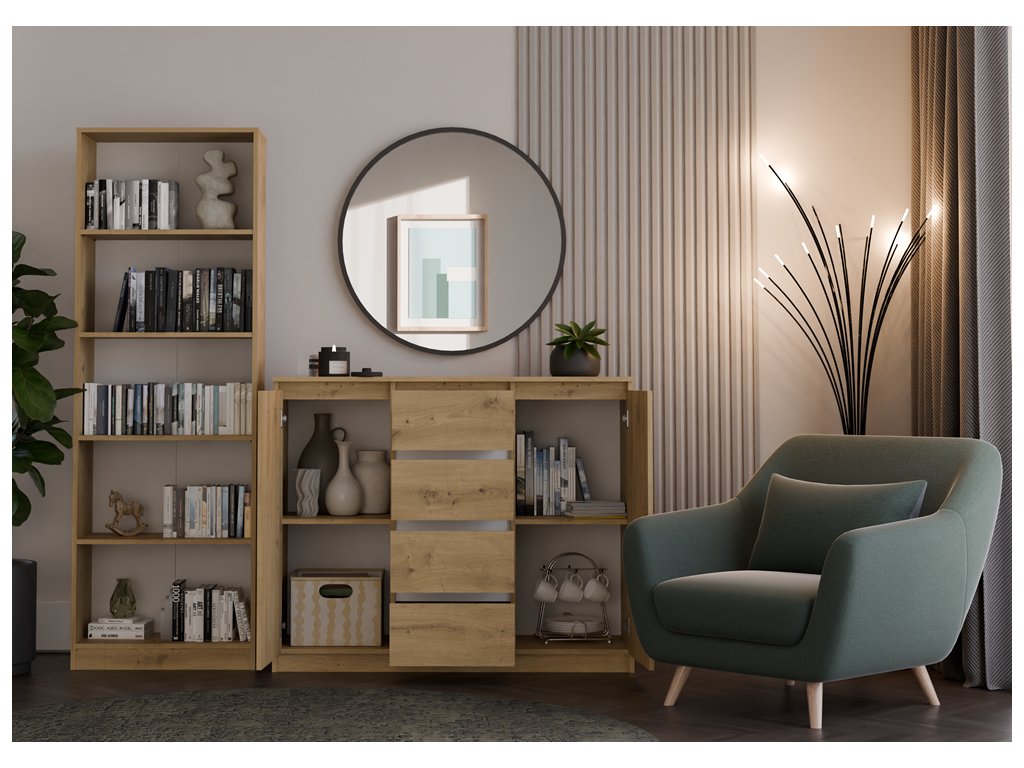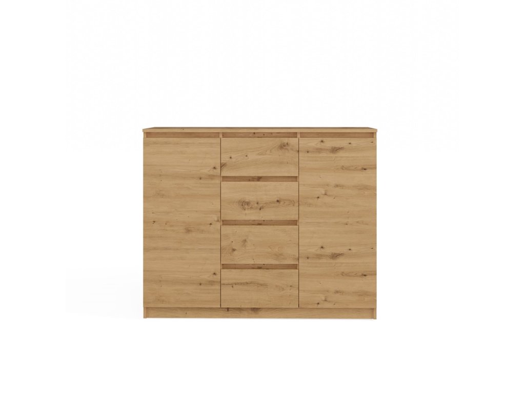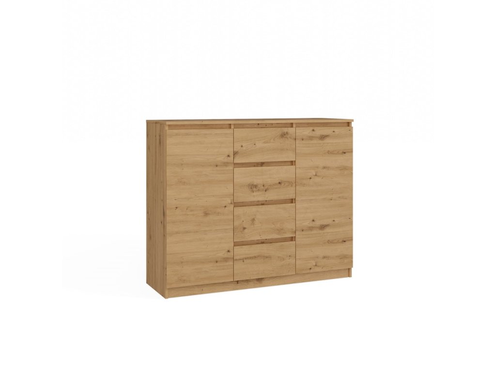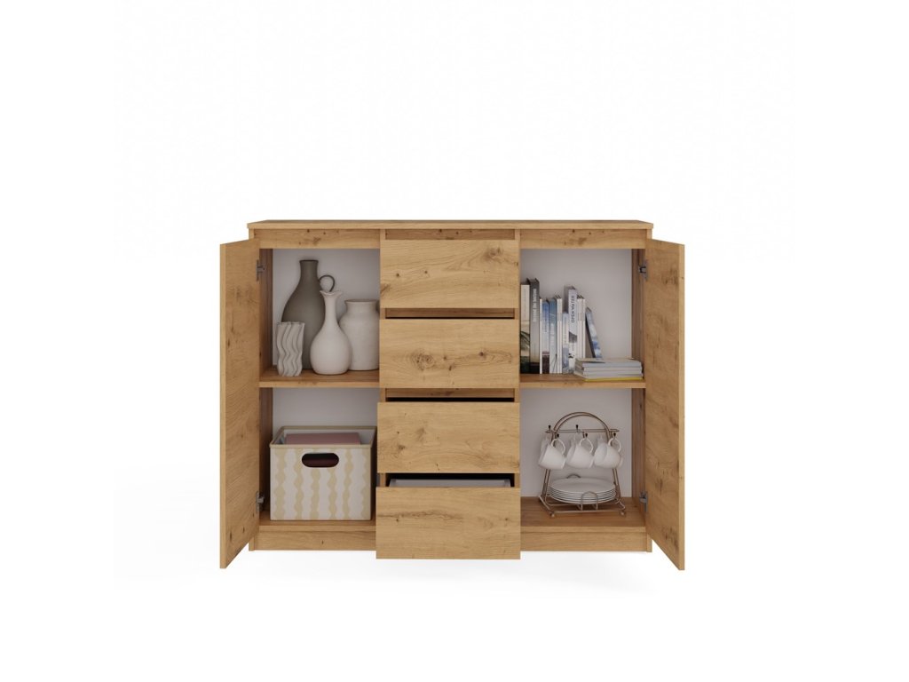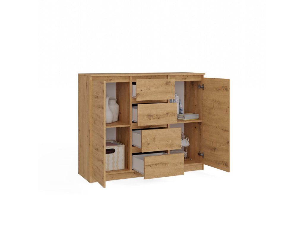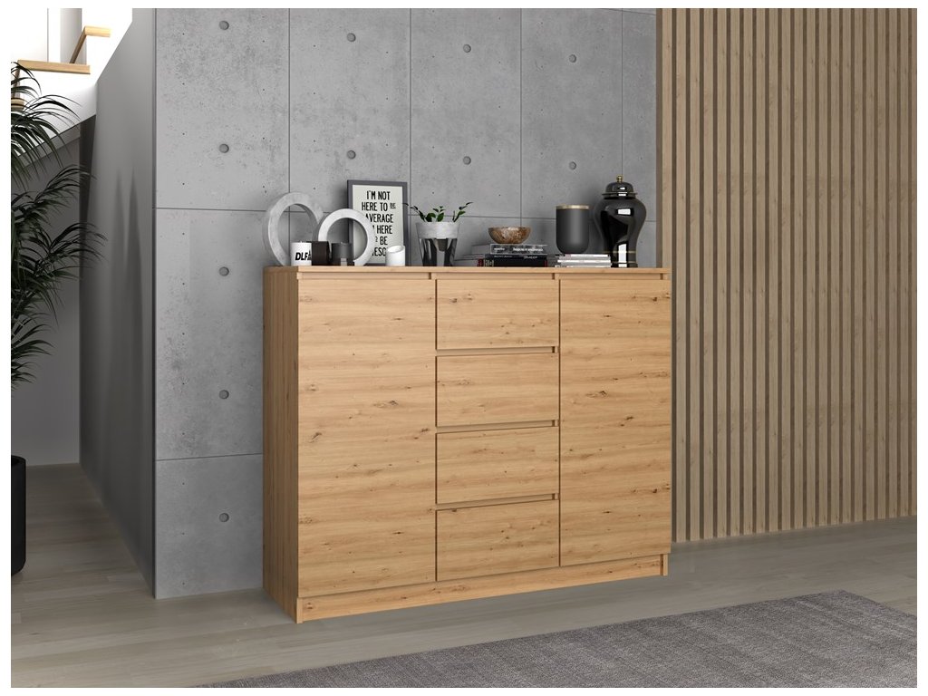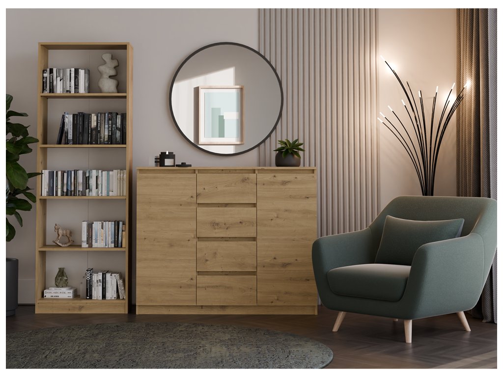 Moderní komoda, která se skvěle hodí do ložnice, obývacího nebo dětského pokoje. Její univerzální vzhled splňuje očekávání těch, kteří ocení spojení jednoduchosti a elegance. Vnitřek komody obsahuje čtyři šuplíky a dvě police, které vám pomohou s uspořádáním vašich věcí. Minimalistická konstrukce a šuplíky bez madel dodávají komodě moderní vzhled. Vyrobeno z kvalitní LTD desky, která má tloušťku 16 mm a je nenáročná na údržbu. Dodáváme v demontu.