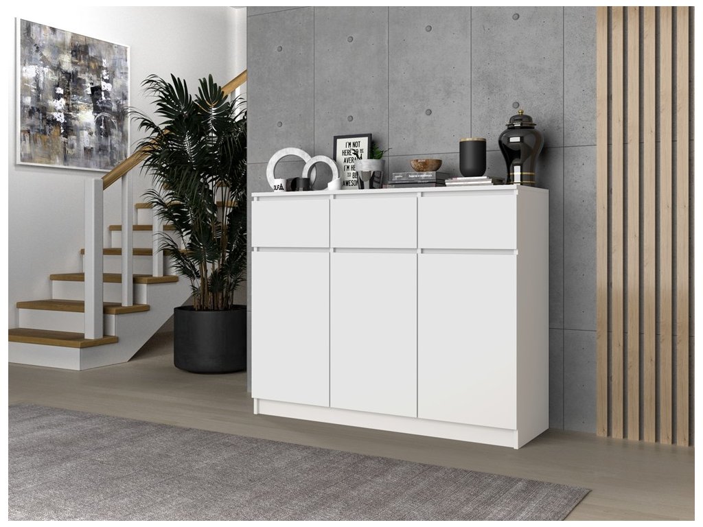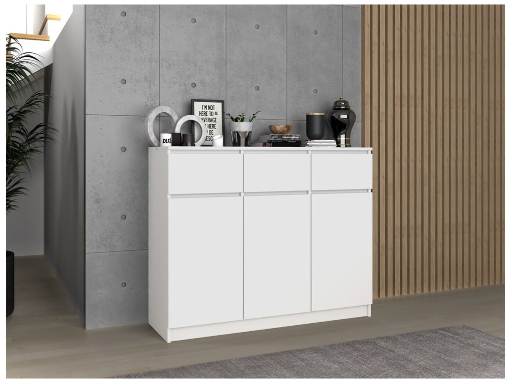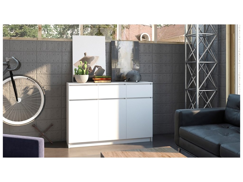 Moderní komoda, která se skvěle hodí do ložnice, obývacího nebo dětského pokoje. Její univerzální vzhled splňuje očekávání těch, kteří ocení spojení jednoduchosti a elegance. Vnitřek komody obsahuje tři šuplíky a tři police, které vám pomohou s uspořádáním vašich věcí. Minimalistická konstrukce a šuplíky bez madel dodávají komodě moderní vzhled. Vyrobeno z kvalitní LTD desky, která má tloušťku 16 mm a je nenáročná na údržbu. Dodáváme v demontu.