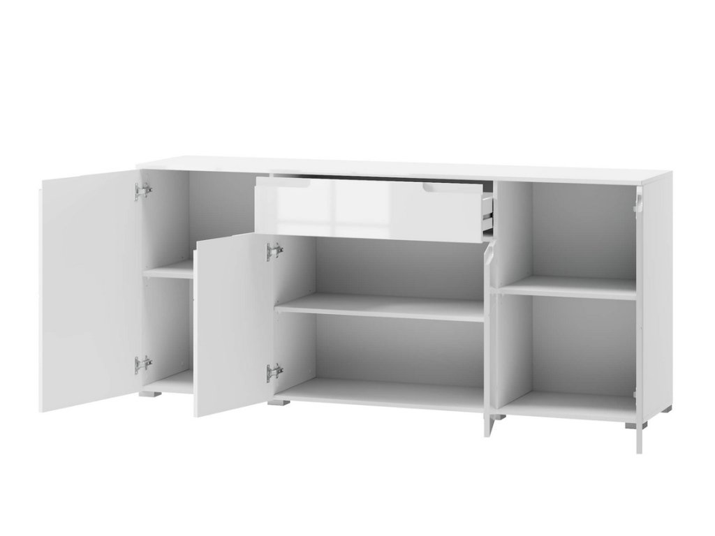 Komoda čtyřdveřová se zásuvkou ze sektorové řady. Jednoduchost a elegance bílé barvy této řady umožňuje kombinaci s dalšími barvami vašeho interiéru. Korpus je vyroben z kvalitní LTD desky v barvě bílá mat. Dvířka jsou vyrobeny z MDF desky v barvě bílá lesk. Úchyty jsou vyfrézovány do čelní desky. Široká nabídka komponentů této sektorové řady umožňuje sestavit si nábytek nejen do jídelny či předsíně, ale také do ložnice, obývacího nebo studentského pokoje dle vlastních představ. Dodáváme v demontovaném stavu.Doplňkové parametry