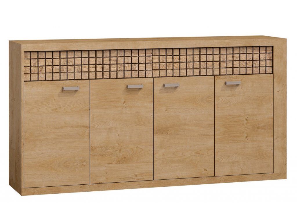 Komoda má 4 dveře a 2 zásuvky. Jedná se o stylovou kolekci nábytku moderního stylu, který je vhodný do obývacího pokoje a ložnice. Barevné provedení dub ribbeck. Vsazením ozdobné kostičkované lišty je zvýrazněn rustikální vzhled masivního dřeva. Nábytek je vyroben z kvalitního lamina 16 mm, některé desky jsou zesíleny na 48 mm, vše ohraničené ABS páskou. Dvířka mají systém tichého zavírání. Zásuvky jsou opatřeny systémem PUSH TO OPEN ( zatlač a otevři ). Možnost dokoupit LED osvětlení. Dodáváme v demontovaném stavu.Doplňkové parametry