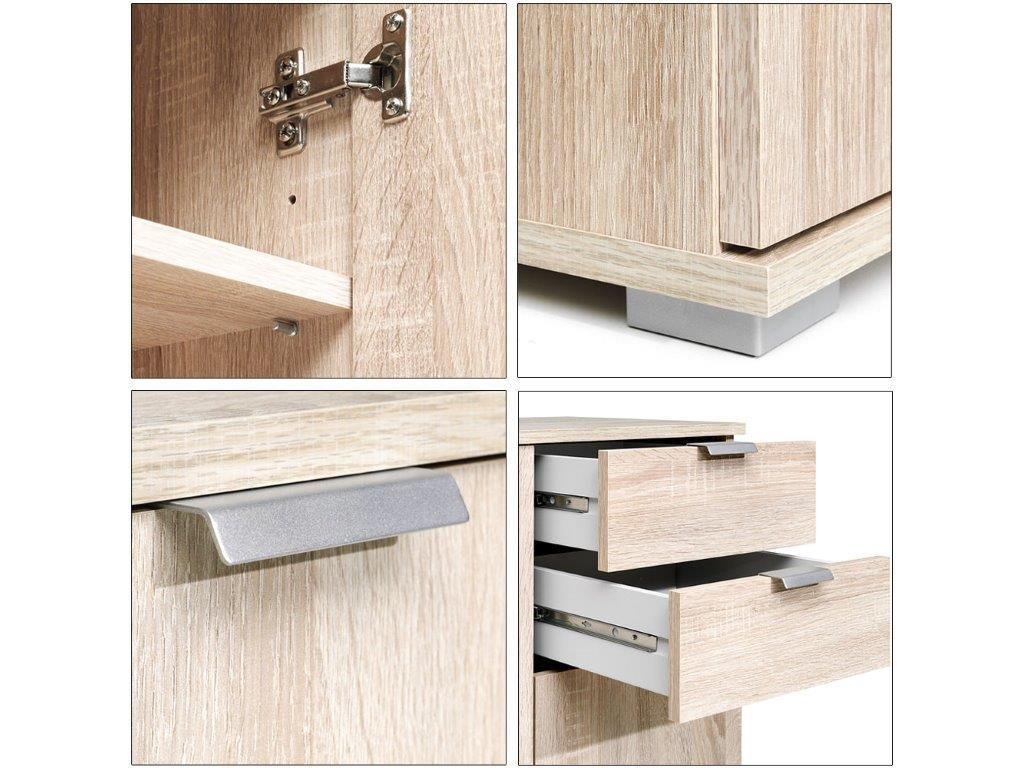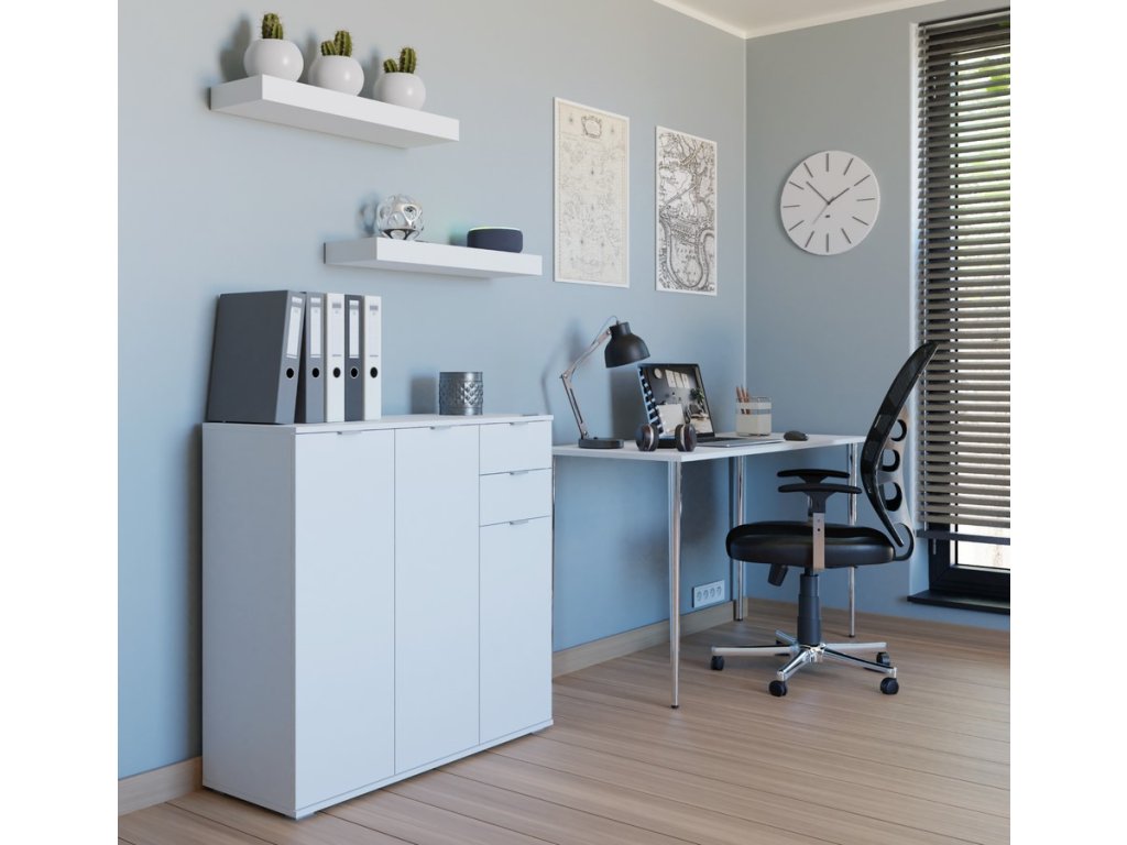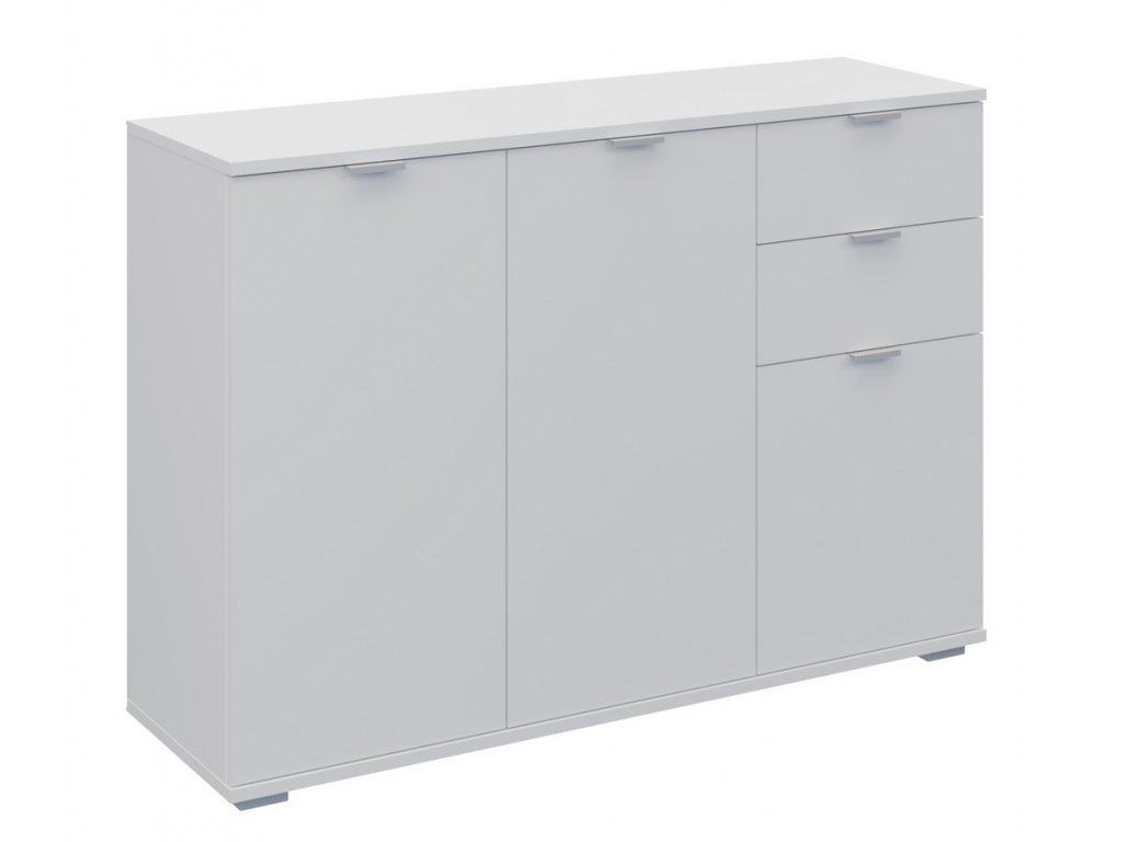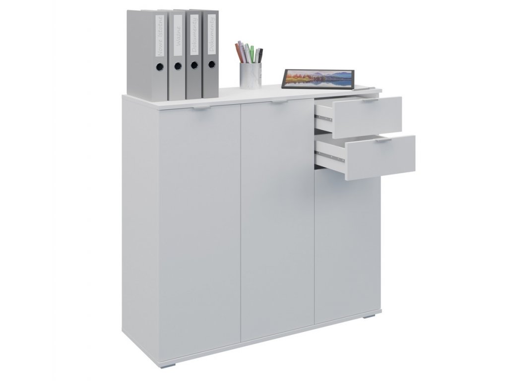 Třídveřová komoda se 2 zásuvkami v moderním provedení. Korpus i dvířka jsou z kvalitní LTD s ABS hranou v barvě matná bílá. Lamino je odolné vůči vysokým teplotám a poškrábání. Dodáváme v demontovaném stavu.Doplňkové parametry