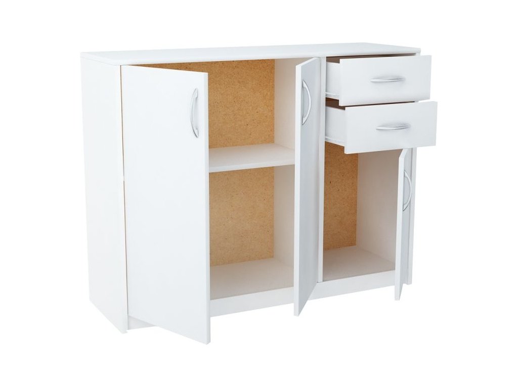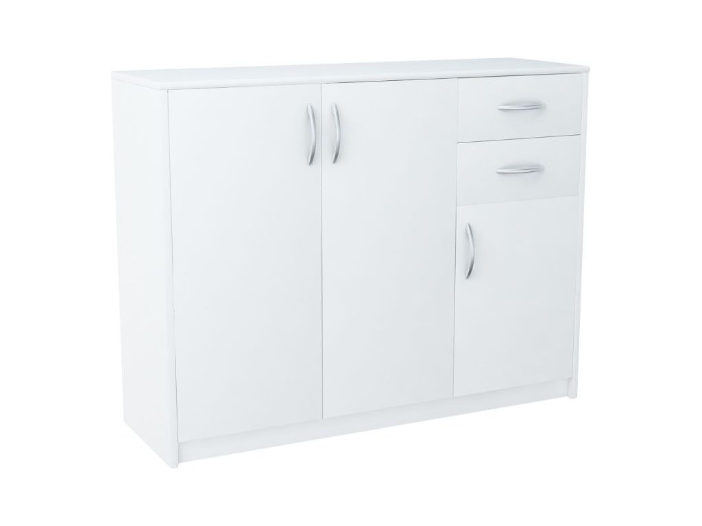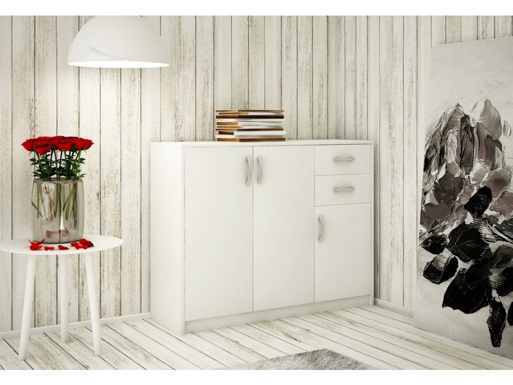 Třídveřová komoda se 2 zásuvkami v moderním provedení. Korpus i dvířka jsou z kvalitní LTD v barvě bílá. Lamino je odolné vůči vysokým teplotám, poškrábání a nárazům, hraněné ABS páskou. Jasně viditelná struktura dřeva. Pojezdy v zásuvkách jsou kovové s plastovými kolečky. Dodáváme v demontovaném stavu.Doplňkové parametry