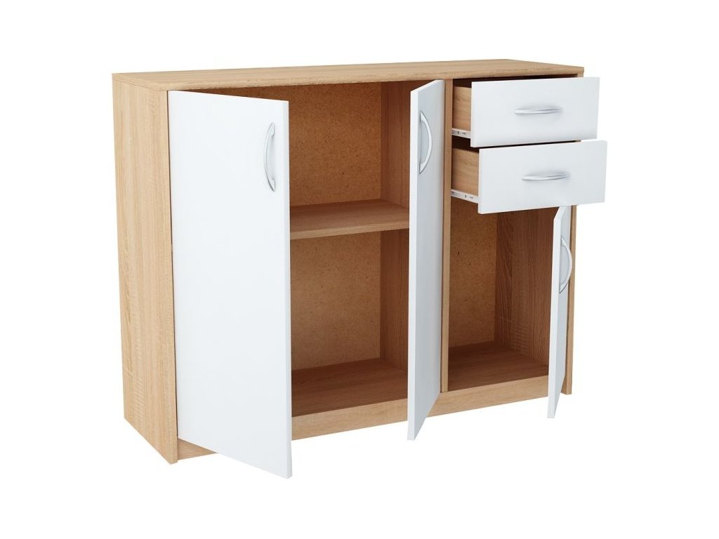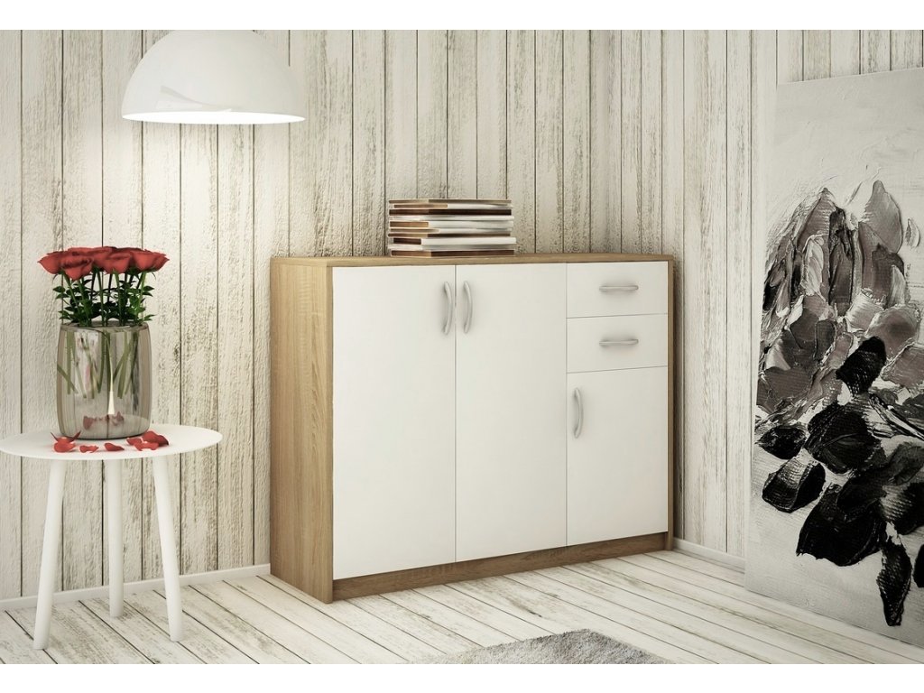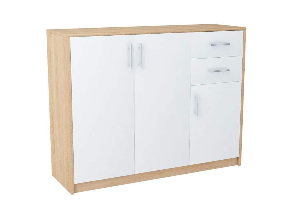 Třídveřová komoda se 2 zásuvkami v moderním provedení. Korpus i dvířka jsou z kvalitní LTD, korpus v barvě dub sonoma a dvířka v barvě bílá. Lamino je odolné vůči vysokým teplotám, poškrábání a nárazům, hraněné ABS páskou. Jasně viditelná struktura dřeva. Pojezdy v zásuvkách jsou kovové s plastovými kolečky. Dodáváme v demontovaném stavu.Doplňkové parametry