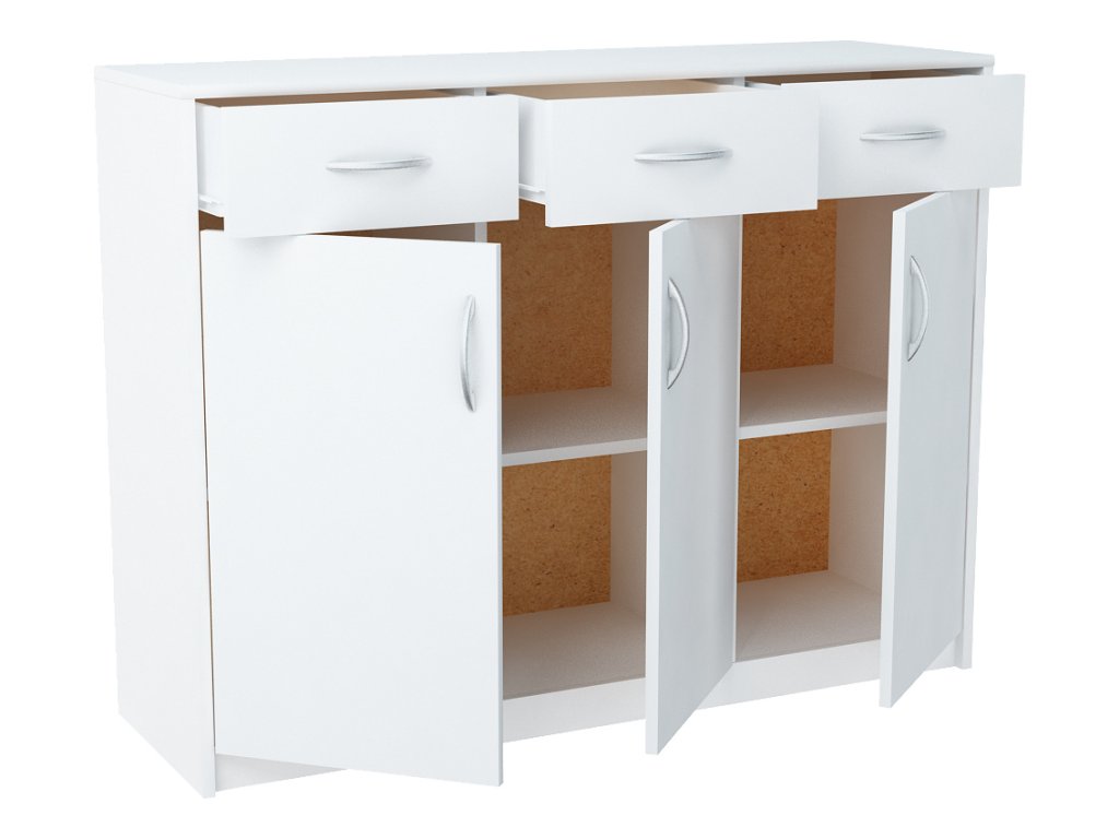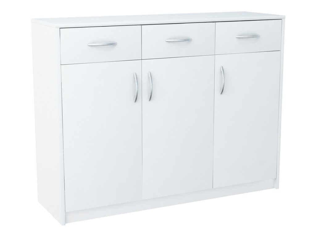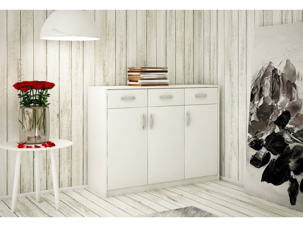 Třídveřová komoda se 3 zásuvkami v moderním provedení. Korpus i dvířka jsou z kvalitní LTD v barvě bílá. Lamino je odolné vůči vysokým teplotám, poškrábání a nárazům, hraněné ABS páskou. Jasně viditelná struktura dřeva. Pojezdy v zásuvkách jsou kovové s plastovými kolečky. Dodáváme v demontovaném stavu.Doplňkové parametry