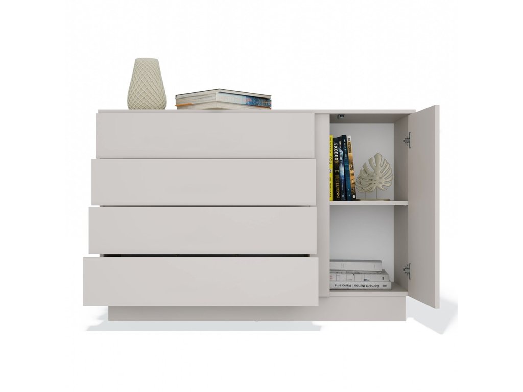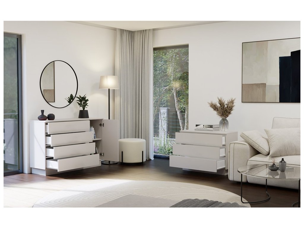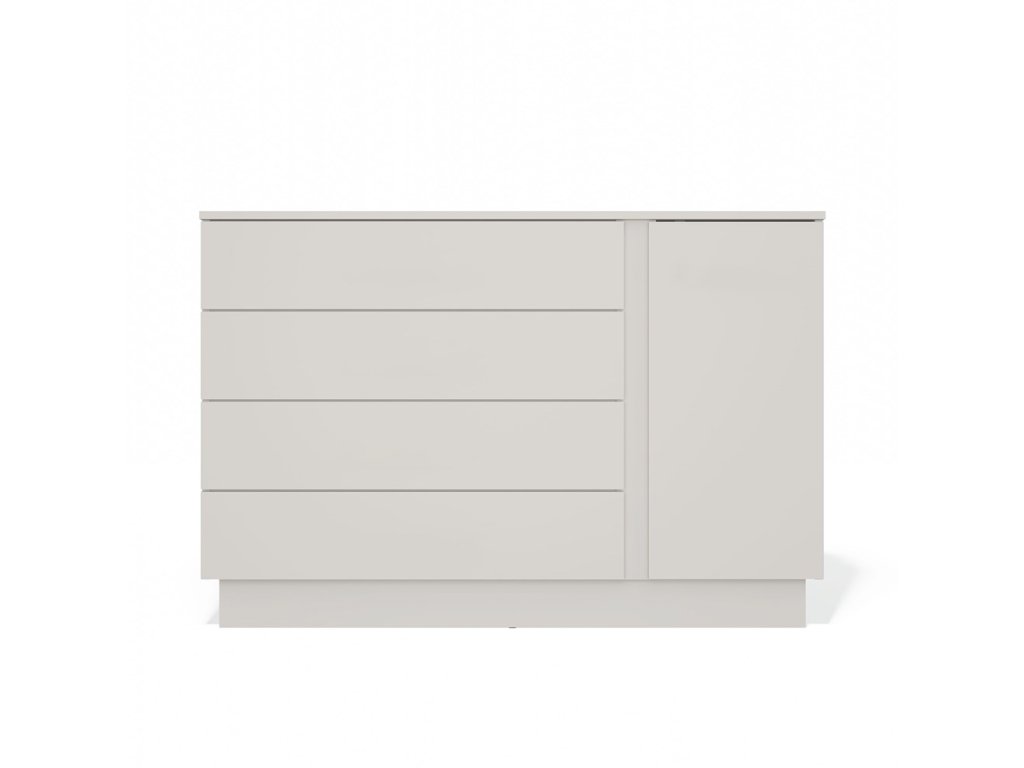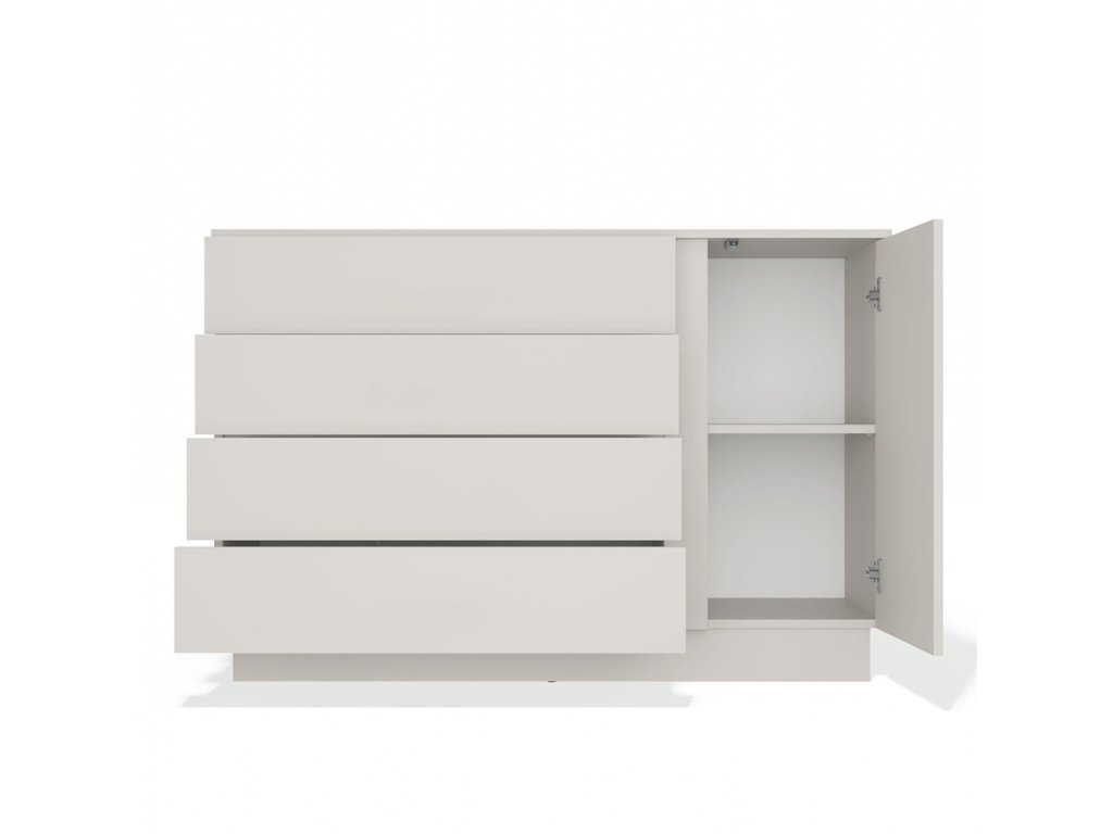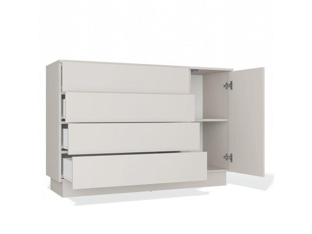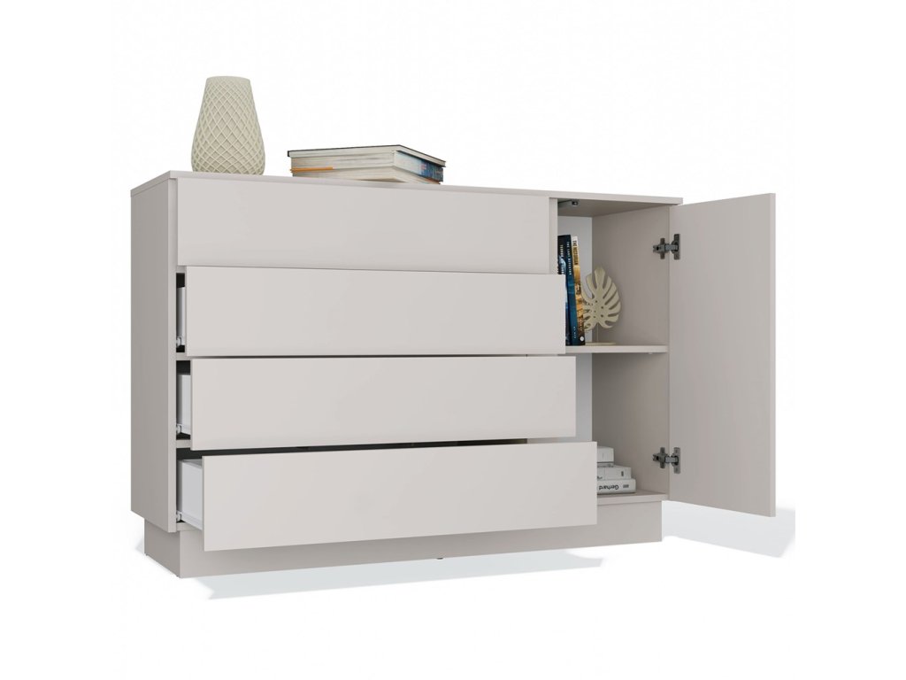 Komoda AMBER 1D4S je moderní a funkční kus nábytku vhodný do obývacího pokoje, ložnice i předsíně. Její minimalistická forma a nadčasové provedení z ní činí univerzální řešení pro různé interiéry. Komoda je vybavena čtyřmi prostornými zásuvkami a jednou skříňkou s policí, která poskytuje další úložný prostor pro oblečení, dokumenty či doplňky. Díky systému TIP-ON se zásuvky otevírají jemným zatlačením, což podtrhuje čistý a moderní vzhled. Kompaktní rozměry umožňují snadné začlenění i do menších místností a zajišťují praktické využití v každodenním životě. Vyrobeno z kvalitní LTD desky, která má tloušťku 16 mm a je nenáročná na údržbu. Dodáváme v demontu.