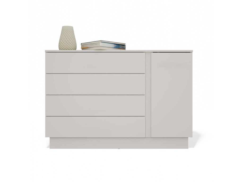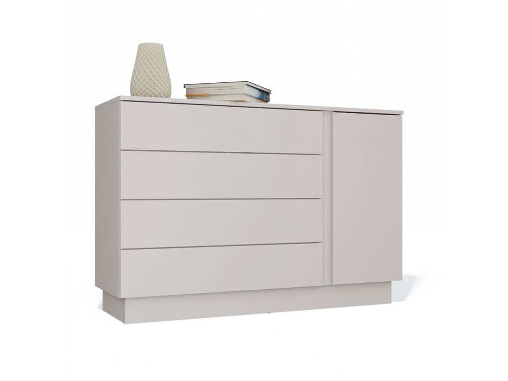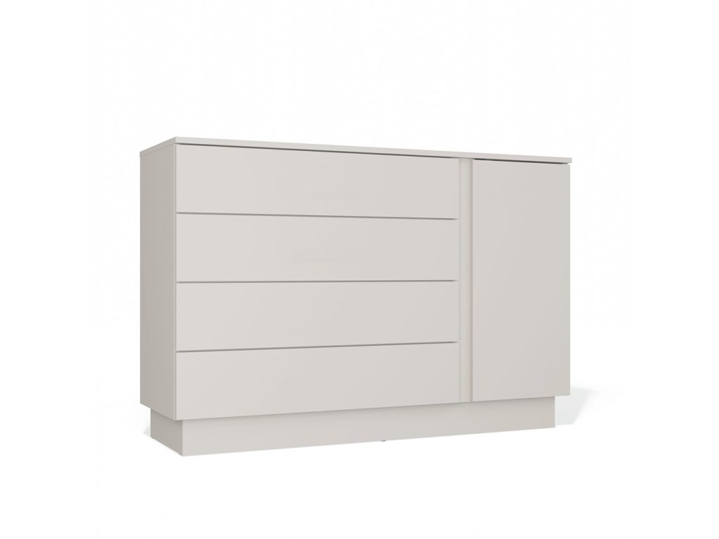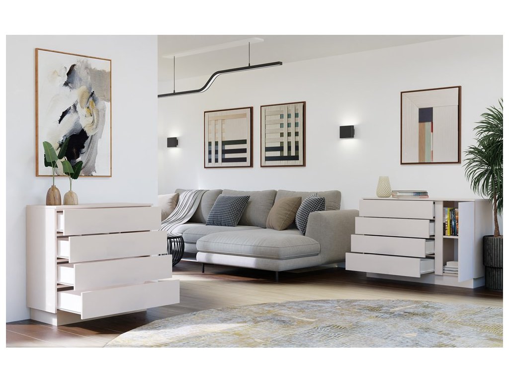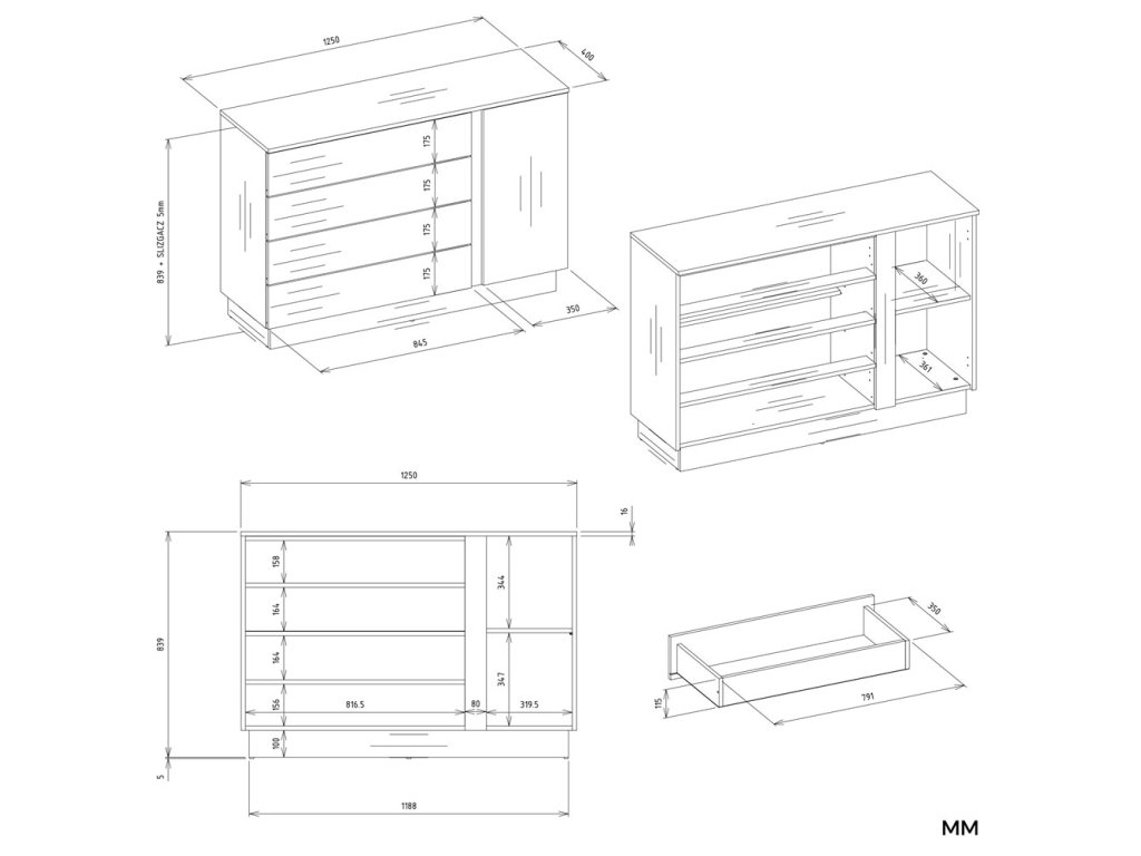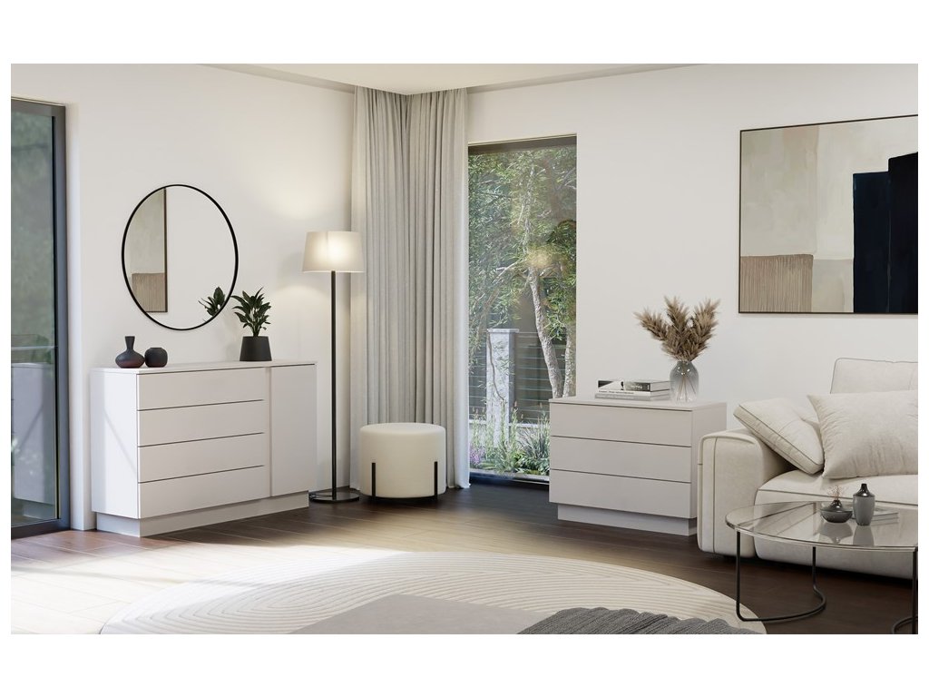 Komoda AMBER 1D4S je moderní a funkční kus nábytku vhodný do obývacího pokoje, ložnice i předsíně. Její minimalistická forma a nadčasové provedení z ní činí univerzální řešení pro různé interiéry. Komoda je vybavena čtyřmi prostornými zásuvkami a jednou skříňkou s policí, která poskytuje další úložný prostor pro oblečení, dokumenty či doplňky. Díky systému TIP-ON se zásuvky otevírají jemným zatlačením, což podtrhuje čistý a moderní vzhled. Kompaktní rozměry umožňují snadné začlenění i do menších místností a zajišťují praktické využití v každodenním životě. Vyrobeno z kvalitní LTD desky, která má tloušťku 16 mm a je nenáročná na údržbu. Dodáváme v demontu.