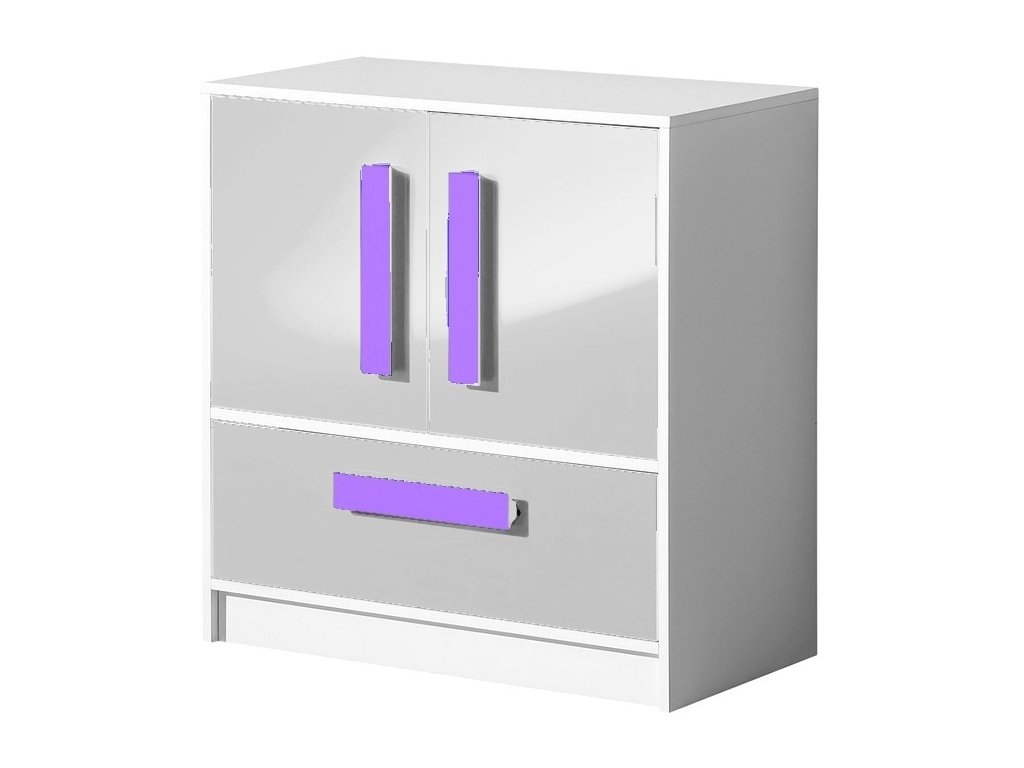 Nízká komoda se zásuvkou ze sektorové řady GULLIWER, která se vyznačuje netradičním zpracováním barev a originalitou úchytů. Tento styl nábytku zaujme každou mladší generaci. Komoda je vyrobena z kvalitní LTD desky hraněné ABS lištou. Korpus je v barvě bílá mat, dveře jsou barvě bílá lesk. Úchytky jsou v barvě fialové. Sektorový nábytek GULLIWER má široký výběr prvků, který Vám zaručí sestavit si dětský nebo studentský pokoj, ložnici či kancelář podle svých potřeb, přání a představ. Dodáváme v demontovaném stavu.Doplňkové parametry