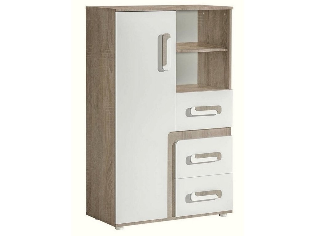 Komoda APETTITA ze sektorové řady, která se vyznačuje netradičním zpracováním barev a originalitou úchytů. Tento styl nábytku zaujme každou mladší generaci. Nábytek je vyroben z kvalitní LTD desky hraněné ABS lištou. Korpus je v barvě dub jasný, dvířka a čela zásuvek jsou bílé matné. Úchytky jsou v barevné kombinaci dub jasný/bílá. Sektorový nábytek APETTITA má široký výběr prvků, který Vám zaručí sestavit si dětský nebo studentský pokoj, ložnici či kancelář podle svých potřeb, přání a představ. Dodáváme v demontovaném stavu.Doplňkové parametry
