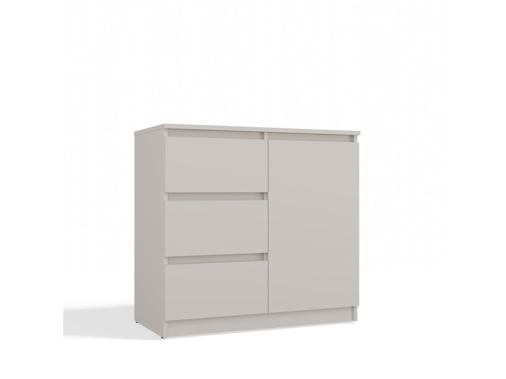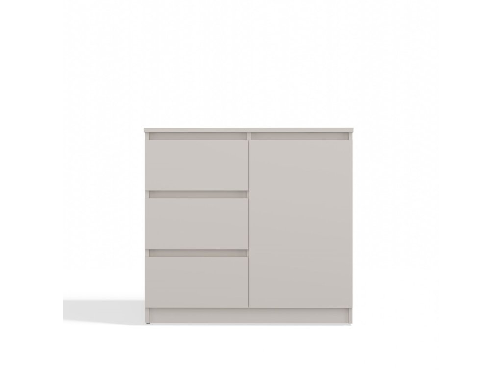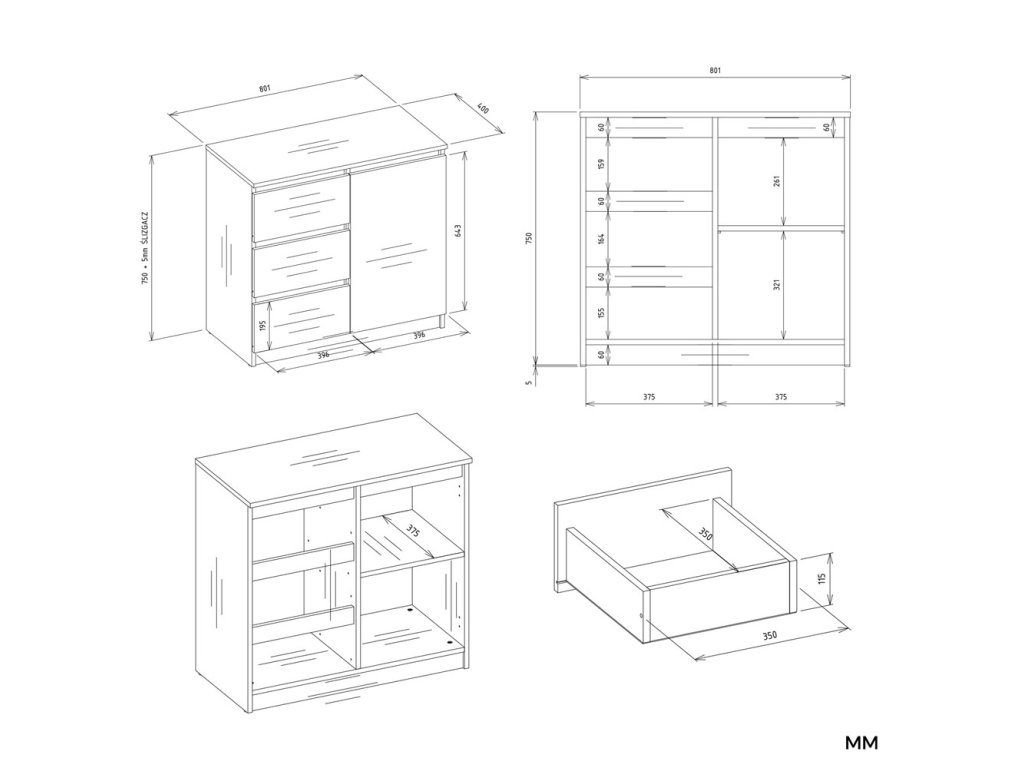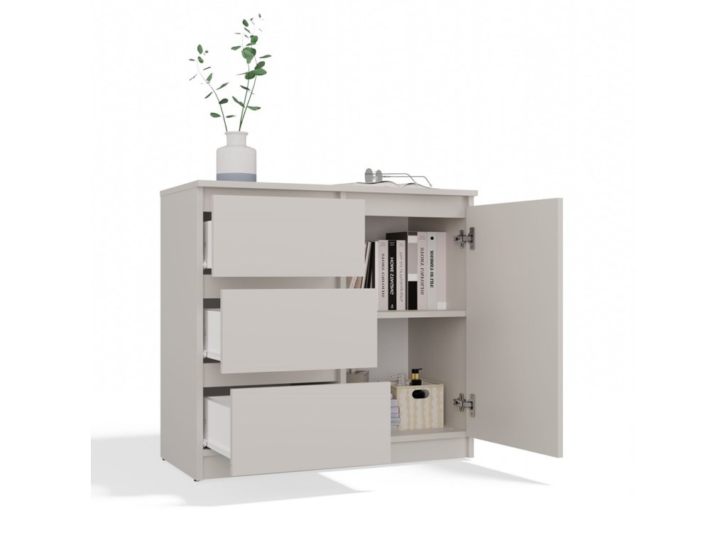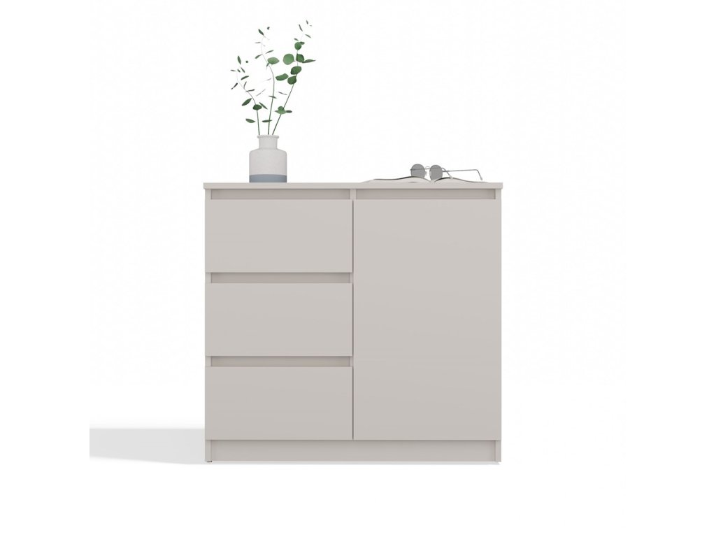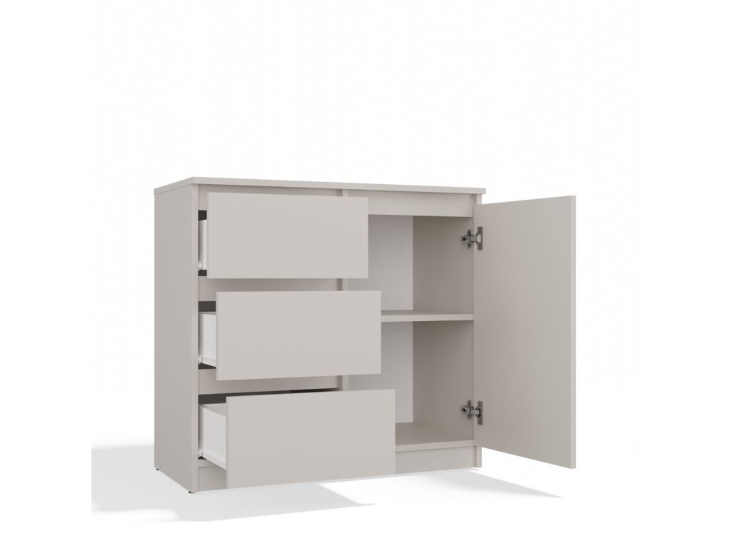 Moderní komoda, která se skvěle hodí do ložnice, obývacího nebo dětského pokoje. Její univerzální vzhled splňuje očekávání těch, kteří ocení spojení jednoduchosti a elegance. Vnitřek komody se skládá ze dvou polic a tří šuplíků, které vám pomohou s uspořádáním vašich věcí. Minimalistická konstrukce a šuplíky bez madel dodávají komodě moderní vzhled. Vyrobeno z kvalitní LTD desky, která má tloušťku 16 mm a je nenáročná na údržbu. Dodáváme v demontu.