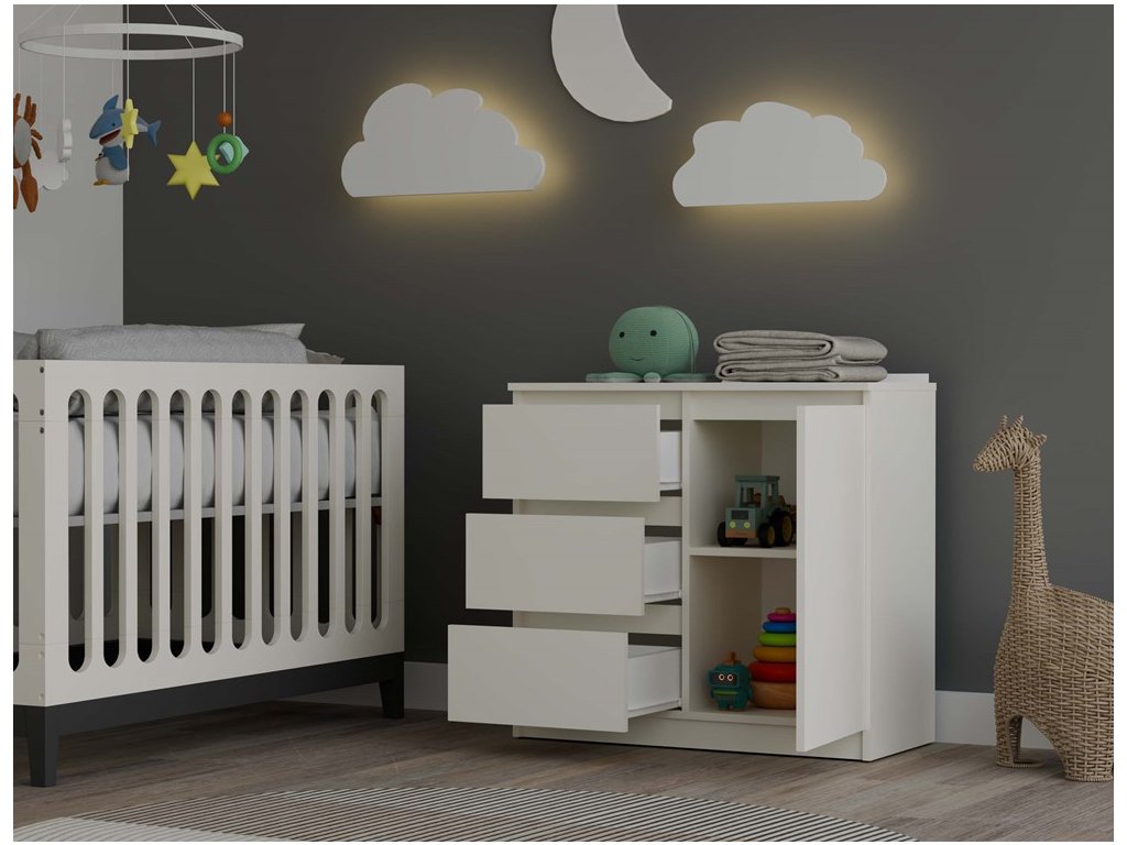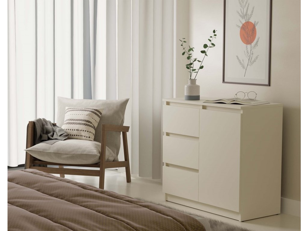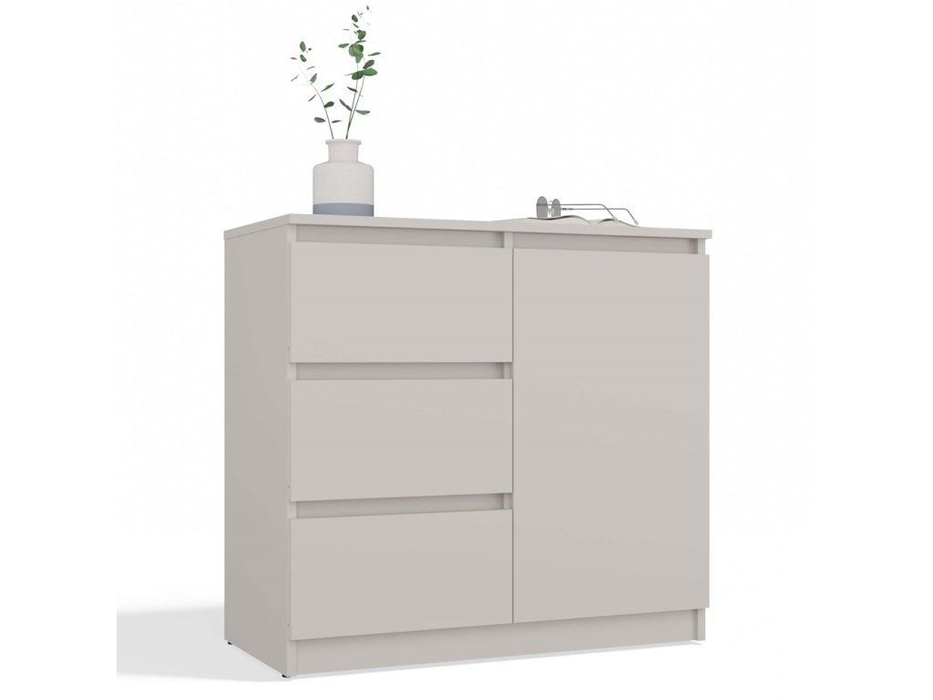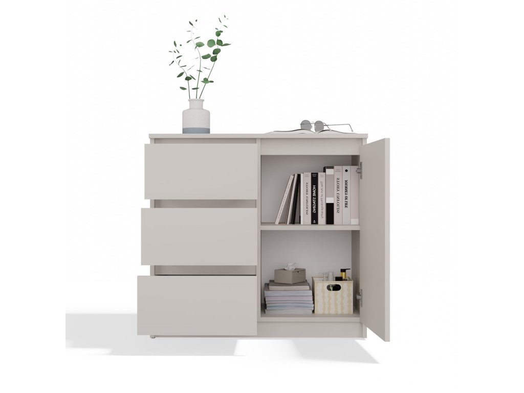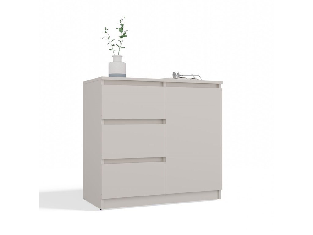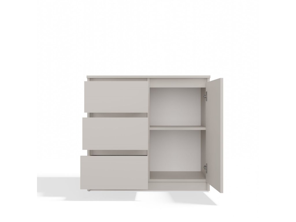 Moderní komoda, která se skvěle hodí do ložnice, obývacího nebo dětského pokoje. Její univerzální vzhled splňuje očekávání těch, kteří ocení spojení jednoduchosti a elegance. Vnitřek komody se skládá ze dvou polic a tří šuplíků, které vám pomohou s uspořádáním vašich věcí. Minimalistická konstrukce a šuplíky bez madel dodávají komodě moderní vzhled. Vyrobeno z kvalitní LTD desky, která má tloušťku 16 mm a je nenáročná na údržbu. Dodáváme v demontu.
