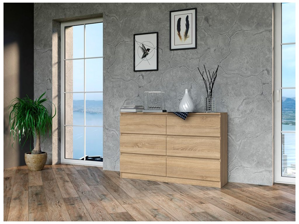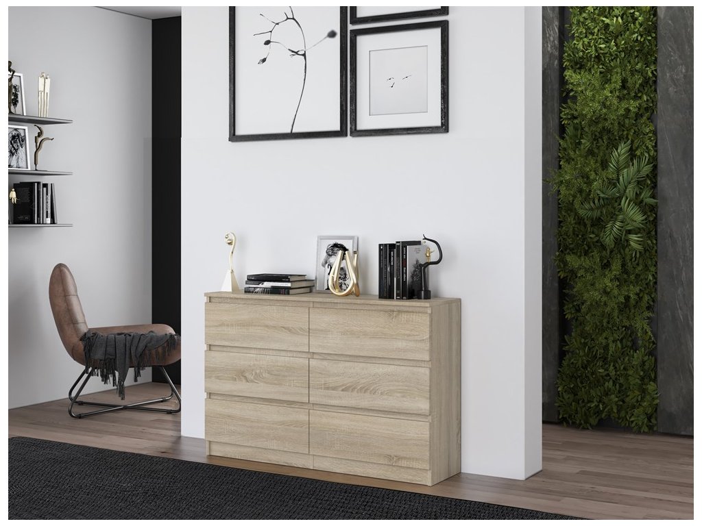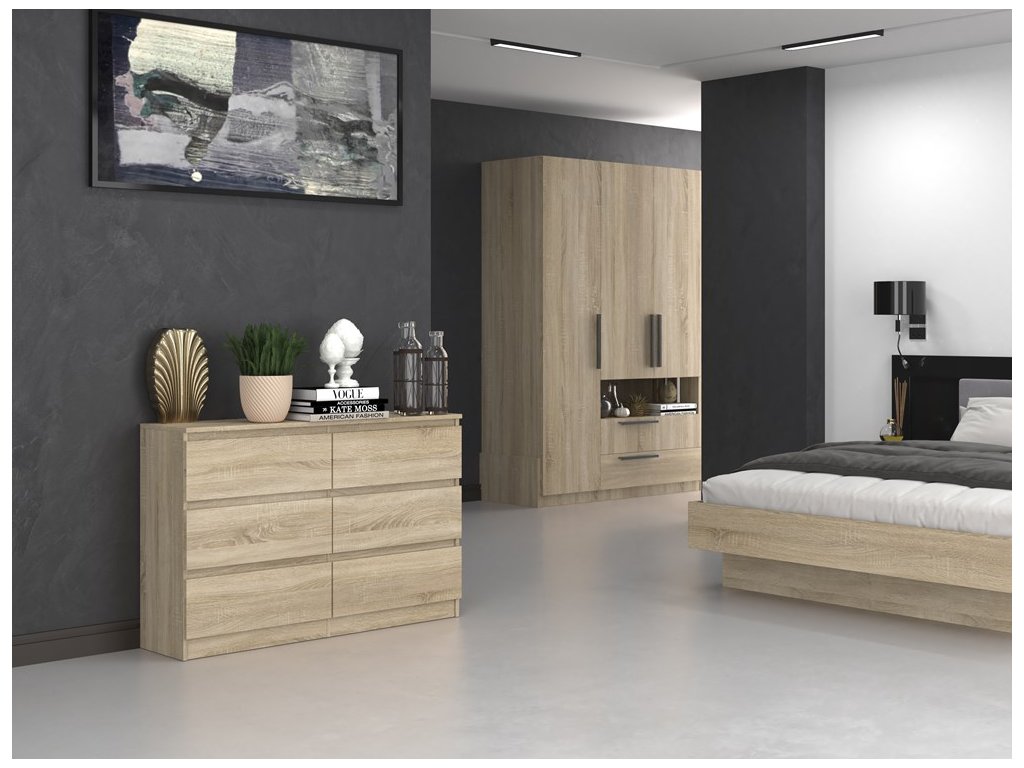 Moderní komoda z kolekce MALWA představuje funkční a prostorný kus nábytku, který skvěle poslouží jako praktický a stylový doplněk vaší ložnice, obývacího pokoje nebo dokonce dětského pokoje. Svým univerzálním designem splňuje očekávání všech těch, kteří upřednostňují spojení jednoduchosti a elegance ve svém domově. Jeho minimalistická konstrukce a šuplíky bez madel dodávají komodě moderní vzhled, ale zároveň zajišťují pohodlné a bezproblémové používání. Vyrobeno z kvalitní LTD desky, která má tloušťku 16 mm a je nenáročná na údržbu. Dodáváme v demontu. V naší další nabídce naleznete kompletní sortiment z kolekce MALWA.Doplňkové parametry