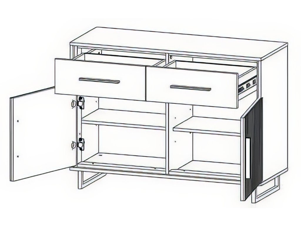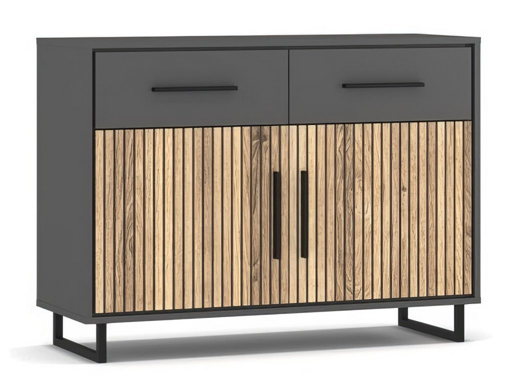 Komoda dvoudveřová se dvěma zásuvkami v industriálním stylu je vyrobena z LTD desky, korpus je v barvě šedé, přední část dvířek je doplněna lištami z přírodního dubového dřeva. Nohy jsou kovové černé. Nábytek disponuje teleskopickými pojezdy a systémem samodovíracích závěsů. Nabídka komponentů této sektorové řady umožňuje sestavit si nábytek dle vlastních představ. Dodáváme v demontovaném stavu.Doplňkové parametry
