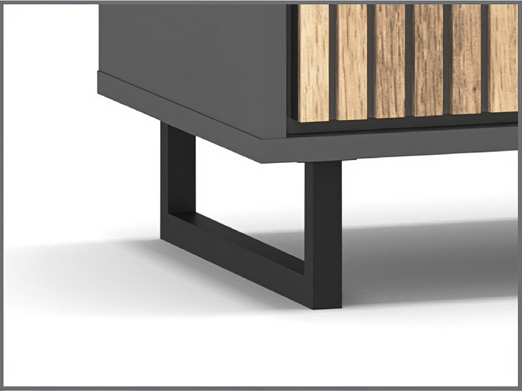 Komoda dvoudveřová se třemi zásuvkami v industriálním stylu je vyrobena z LTD desky, korpus je v barvě šedé, přední část dvířek je doplněna lištami z přírodního dubového dřeva. Zásuvky jsou umístěny v pravé části komody. Nohy jsou kovové černé. Nábytek disponuje teleskopickými pojezdy a systémem samodovíracích závěsů. Nabídka komponentů této sektorové řady umožňuje sestavit si nábytek dle vlastních představ. Dodáváme v demontovaném stavu.Doplňkové parametry