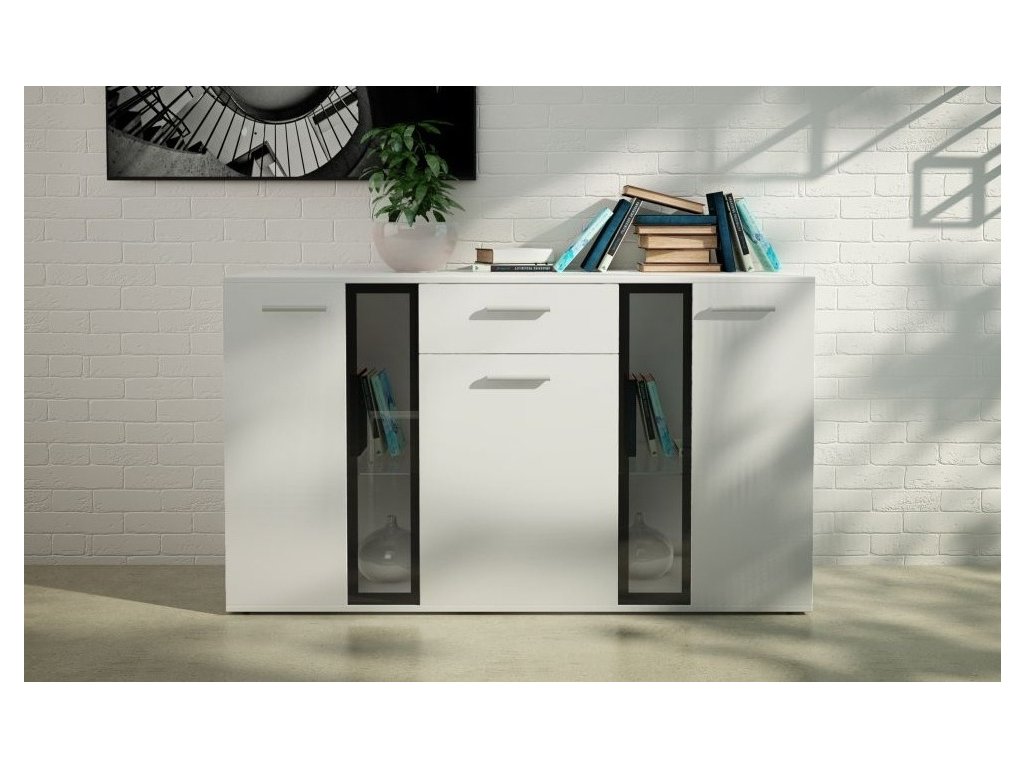 Komoda v moderním stylu. Komoda je částečně prosklená, má 3 dvířka a 1 praktickou zásuvku. Barevné provedení bílá mat. Tato komoda krásně doplní obývací stěnu, kterou rovněž najdete v naší nabídce. Nábytek je vyroben z kvalitního lamina. Sklo ve vitríně je čiré. Dodáváme v demontovaném stavu.Doplňkové parametry