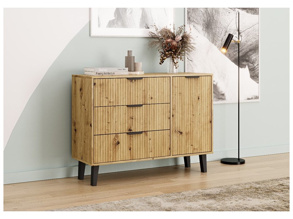 Charakteristickým prvkem této komody jsou ryhované čelní plochy, které připomínají moderní lamelový design a dodávají nábytku jedinečný vzhled. Celkový dojem doplňují decentní černé úchyty a vysoké nožky, které komodě propůjčují vzdušnost a nadčasový šmrnc.