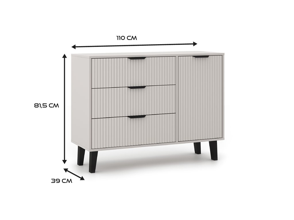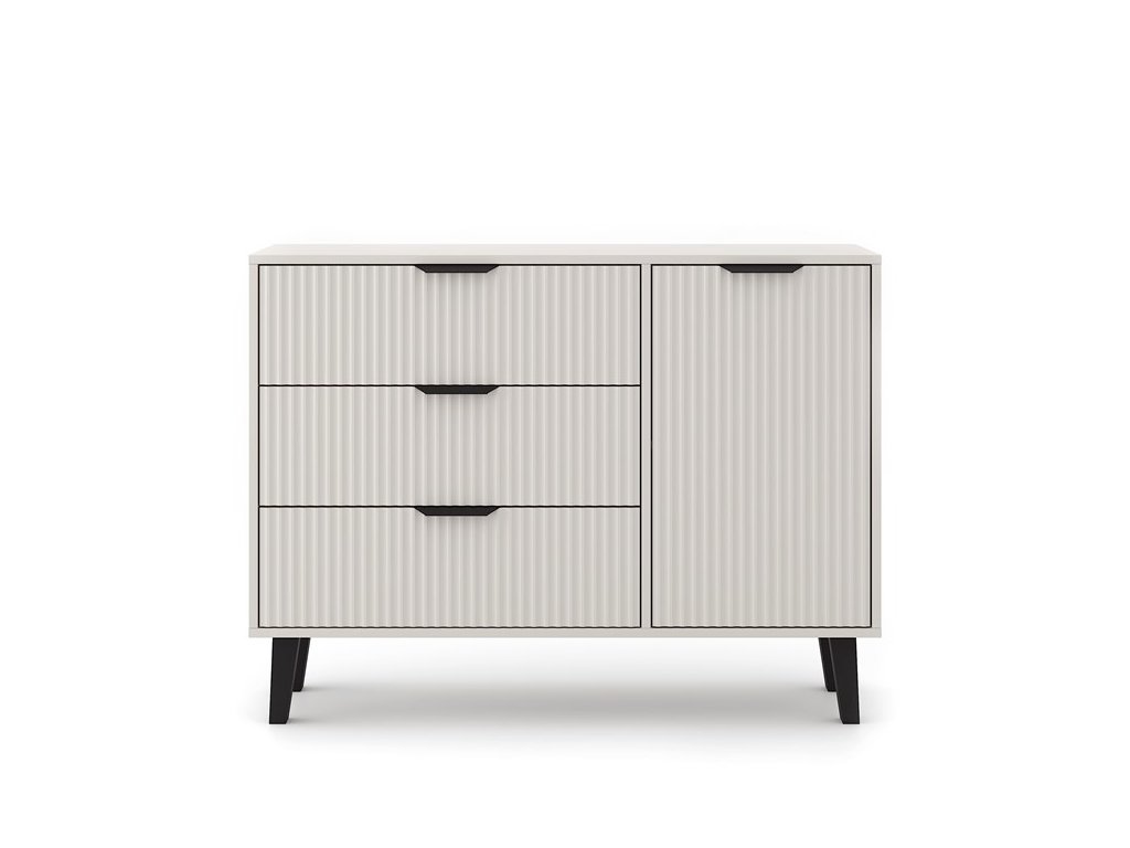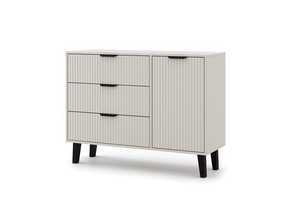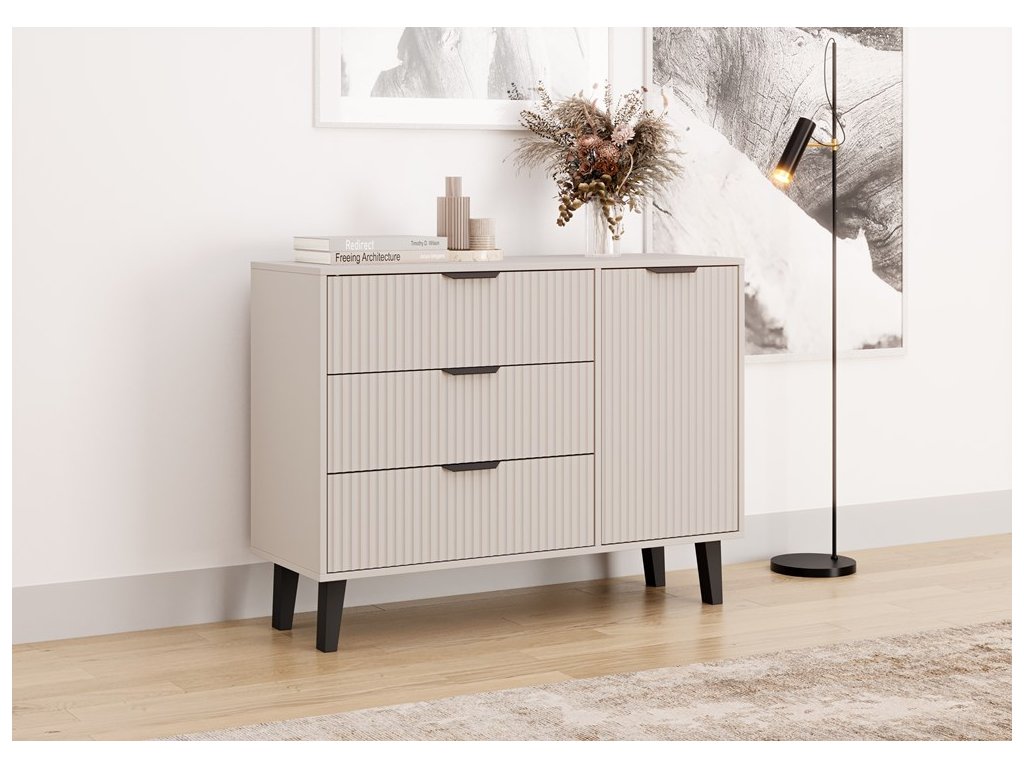 Charakteristickým prvkem této komody jsou ryhované čelní plochy, které připomínají moderní lamelový design a dodávají nábytku jedinečný vzhled. Celkový dojem doplňují decentní černé úchyty a vysoké nožky, které komodě propůjčují vzdušnost a nadčasový šmrnc.