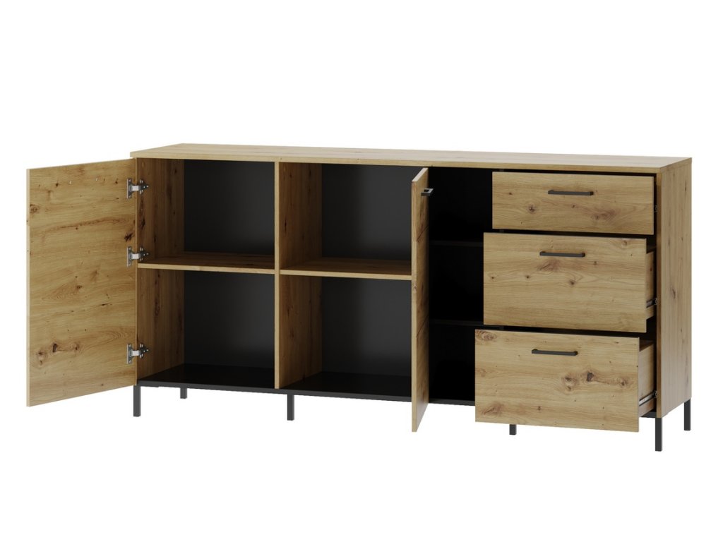 Komoda dvoudveřová se třemi zásuvkami. Komoda je vyrobena z kvalitní desky LTD v barvě dub artisan/černá mat. Úchyty jsou z černého plastu, nožky jsou černé kovové. Dodáváme v demontovaném stavu.Doplňkové parametry