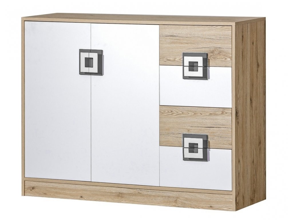 Komoda široká NIKO ze sektorové řady, která se vyznačuje netradičním zpracováním barev a originalitou úchytů. Tento styl nábytku zaujme každou mladší generaci. Komoda je vyrobena z kvalitní LTD desky hraněné ABS lištou. Korpus je v barvě dub jasný, dveře jsou v kombinaci barev bílá mat / dub jasný. Úchytky jsou v barevné kombinaci popel / bílá. Uvnitř komody je police a 4 zásuvky v pravé části. Sektorový nábytek NIKO má široký výběr prvků, který Vám zaručí sestavit si dětský nebo studentský pokoj, ložnici či kancelář podle svých potřeb, přání a představ. Dodáváme v demontovaném stavu.Doplňkové parametry