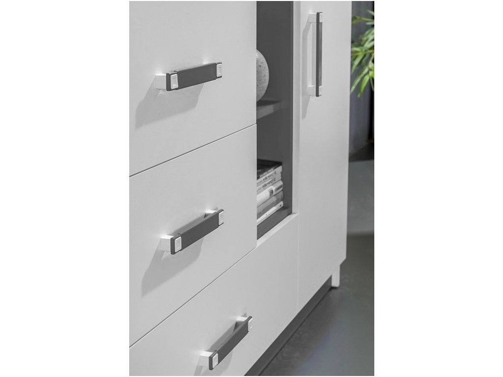 Komoda TRAFICO ze sektorové řady, která se vyznačuje netradičním zpracováním barev a originalitou úchytů. Tento styl nábytku zaujme každou mladší generaci. Komoda je vyrobena z kvalitní LTD desky hraněné ABS lištou. Korpus i dveře jsou v bílé matné barvě, doplňková barva je popel. Úchytky jsou v barevné kombinaci popel/bílá. Sektorový nábytek TRAFICO má široký výběr prvků, který Vám zaručí sestavit si dětský nebo studentský pokoj, ložnici či kancelář podle svých potřeb, přání a představ. Dodáváme v demontovaném stavu.Doplňkové parametry