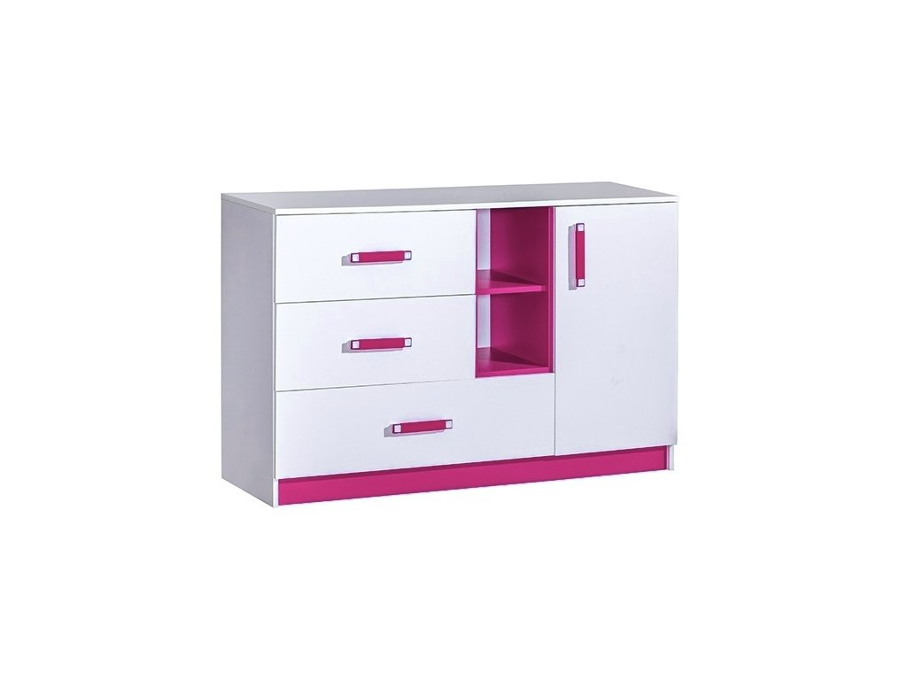 Komoda TRAFICO ze sektorové řady, která se vyznačuje netradičním zpracováním barev a originalitou úchytů. Tento styl nábytku zaujme každou mladší generaci. Komoda je vyrobena z kvalitní LTD desky hraněné ABS lištou. Korpus i dveře jsou v bílé matné barvě, doplňková barva je růžová. Úchytky jsou v barevné kombinaci růžová/bílá. Sektorový nábytek TRAFICO má široký výběr prvků, který Vám zaručí sestavit si dětský nebo studentský pokoj, ložnici či kancelář podle svých potřeb, přání a představ. Dodáváme v demontovaném stavu.Doplňkové parametry