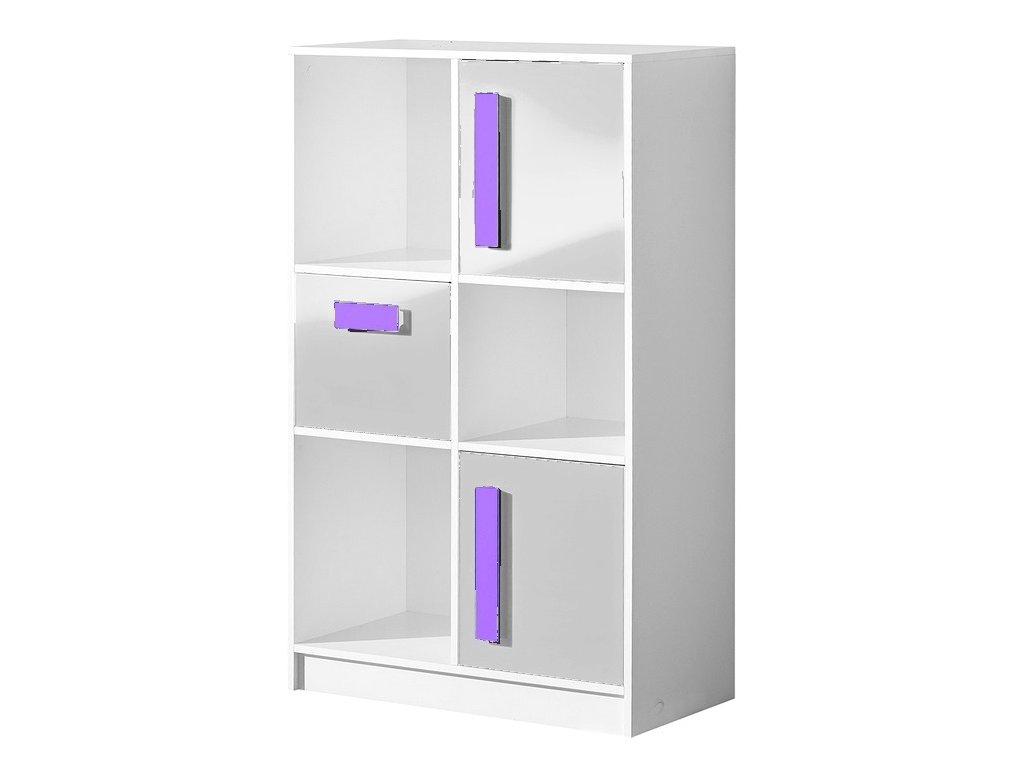 Vysoká komoda s policemi a zásuvkou ze sektorové řady GULLIWER, která se vyznačuje netradičním zpracováním barev a originalitou úchytů. Tento styl nábytku zaujme každou mladší generaci. Komoda je vyrobena z kvalitní LTD desky hraněné ABS lištou. Korpus je v barvě bílá mat, dveře jsou barvě bílá lesk. Úchytky jsou v barvě fialové. Sektorový nábytek GULLIWER má široký výběr prvků, který Vám zaručí sestavit si dětský nebo studentský pokoj, ložnici či kancelář podle svých potřeb, přání a představ. Dodáváme v demontovaném stavu.Doplňkové parametry