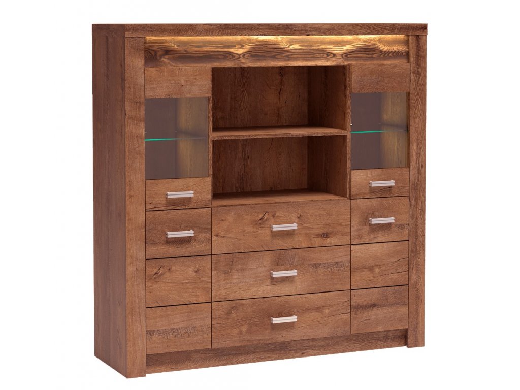 Vitrínová komoda ze sektorové řady. Komoda má po stranách 2 vitríny a 2 skříňky, za kterými je jedna polička, uprostřed jsou 3 zásuvky a nad nimi jedna polička. Systém je exkluzivní kolekce navržena v moderním duchu. Vsazením LED osvětlení do ozdobné rýhované lišty, které najdete v naší další nabídce k dokoupení, je zvýrazněn rustikální vzhled masivního dřeva. Možnost dokoupení LED bodového osvětlení i u skleněných polic. Celá řada se vyznačuje elegancí a jednoduchými tvary, které zaručují plné využití prostoru. Nábytek je vyroben z kvalitního lamina s ABS hrany ( 0,5-0,8 mm ). Barevné provedení jasan světlý. Dodáváme v demontovaném stavu.Doplňkové parametry
