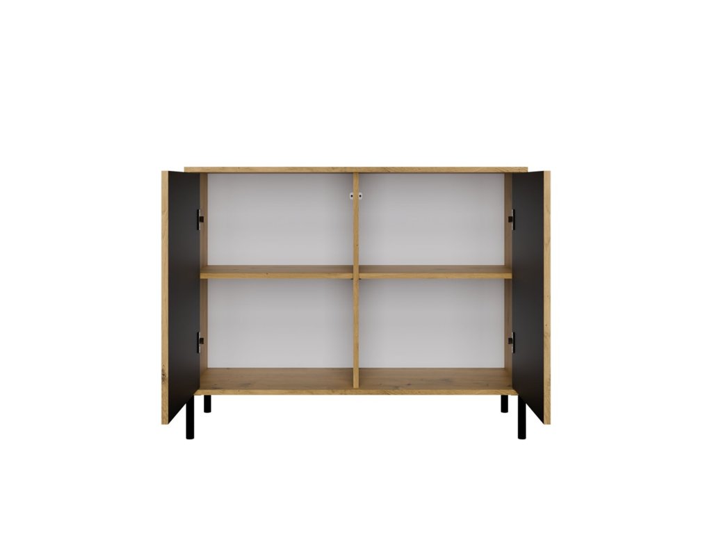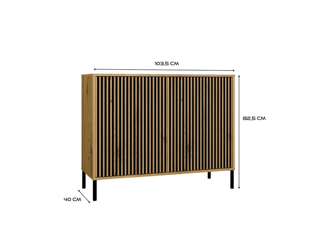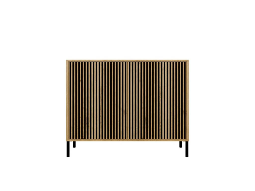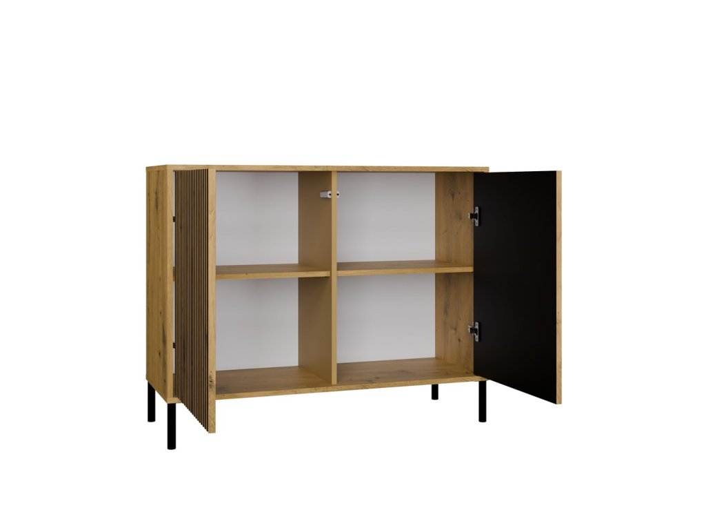 Komoda KAMARO 2D je spojením moderní estetiky a chytrého řešení úložného prostoru. Ryflované čela dvířek (18mm MDF) připomínající lamely dodává nábytku osobitý a stylový vzhled, který zaujme v každém interiéru. Otevírání pomocí bezúchytového systému TIP-ON zajišťuje maximální pohodlí a zároveň podtrhuje minimalistický charakter nábytku. Uvnitř komody se nachází čtyři praktické police, které nabízí dostatek místa pro uspořádání všeho, co potřebujete mít po ruce – ať už v obývacím pokoji, ložnici nebo domácí kanceláři.