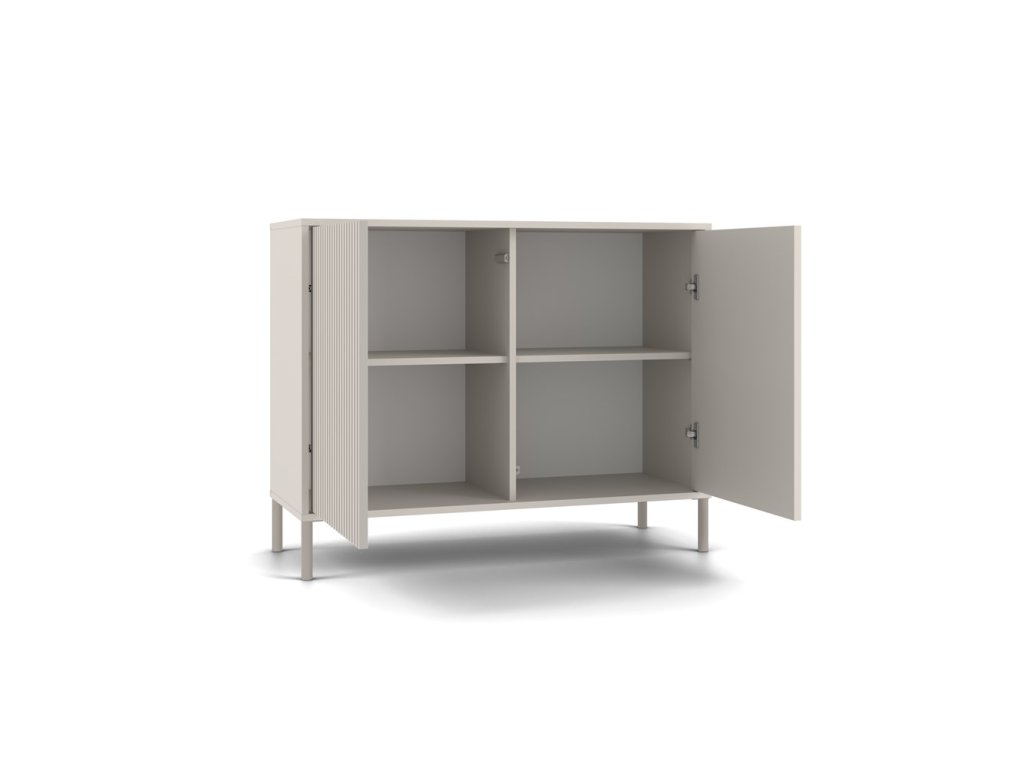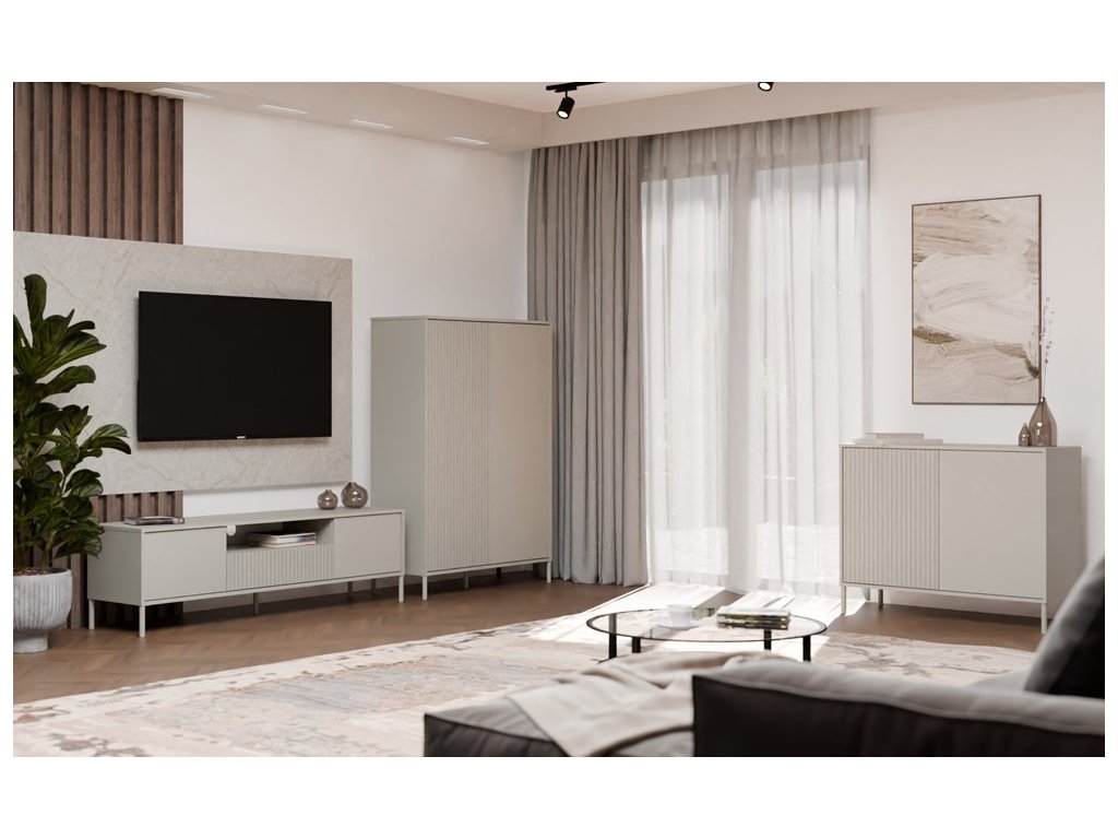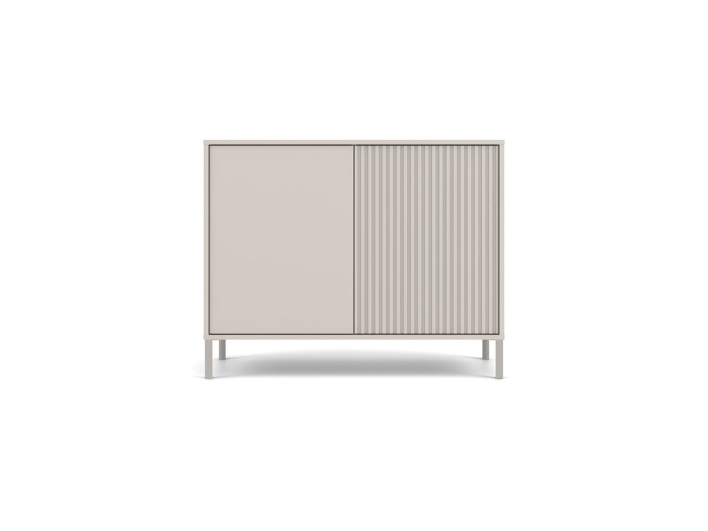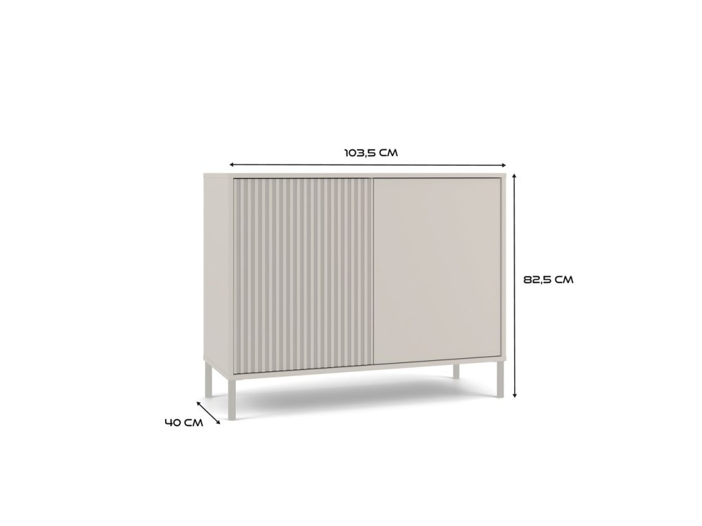 Komoda KAMARO 2D SLIM v barvě kašmír přináší jedinečný vzhled díky kombinaci dvou typů dvířek – jedno hladké a jedno s jemným ryflováním (18mm MDF) ve stylu lamel. Tato vizuální hra textur dodává nábytku osobitý charakter, který se skvěle hodí do moderních i útulných interiérů.Otevírání pomocí bezúchytového systému TIP-ON zajišťuje pohodlné používání – dvířka se otevřou jemným stiskem. Uvnitř komody se nachází čtyři praktické police, které nabídnou dostatek úložného prostoru pro obývací pokoj, pracovnu nebo ložnici. Kovové nožky vysoké 13,5 cm působí vzdušně a zároveň zajišťují stabilitu nábytku.