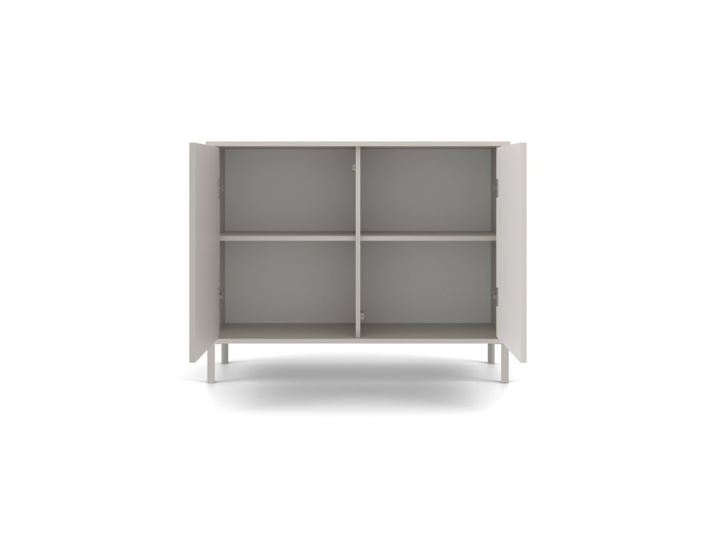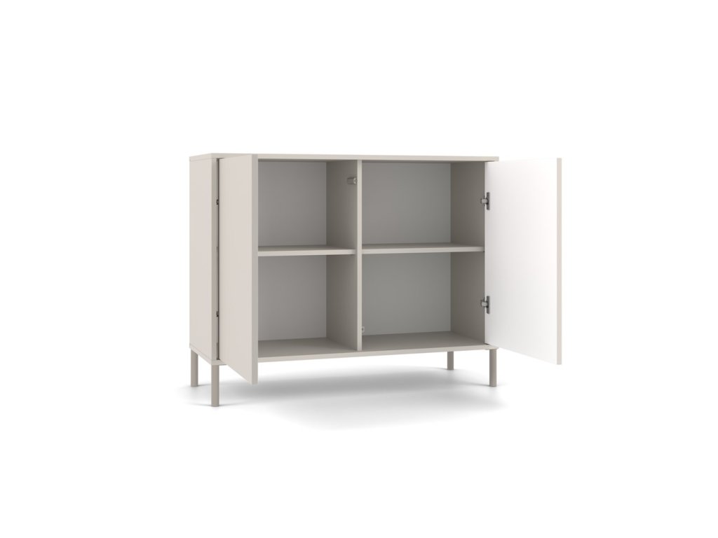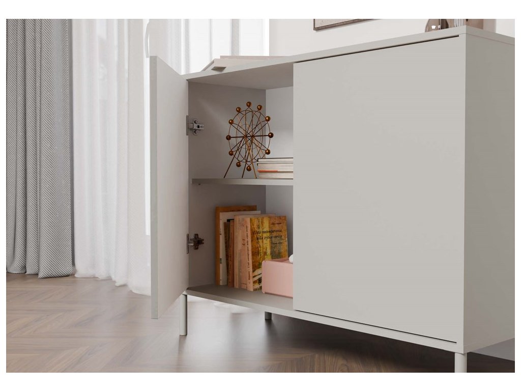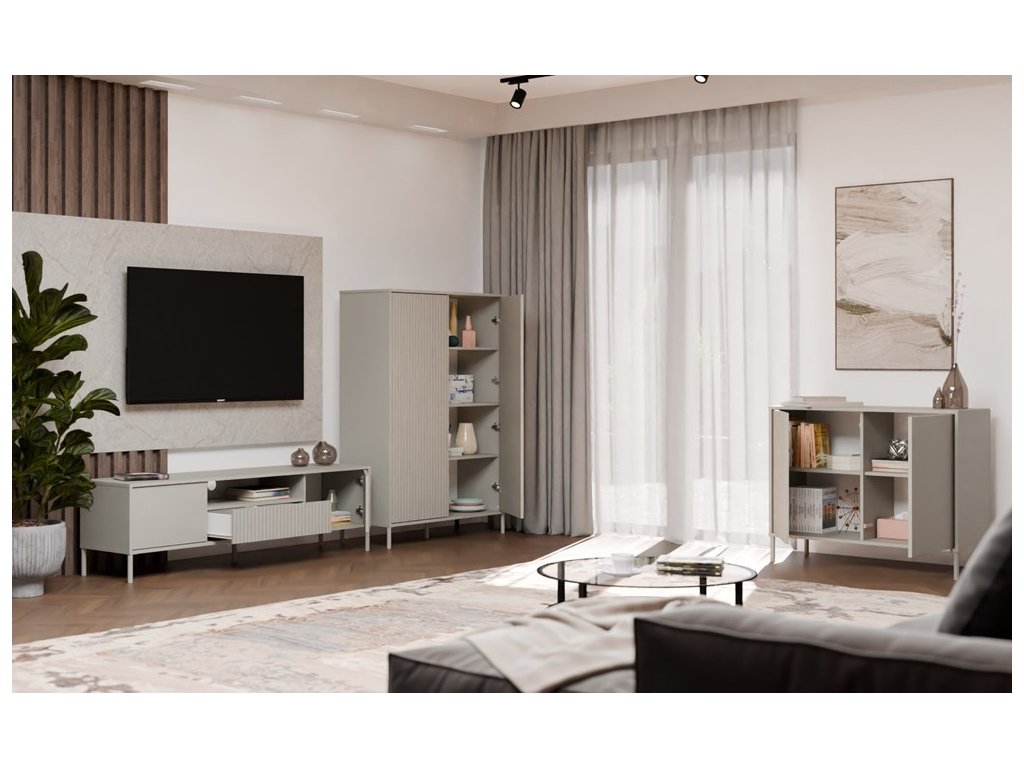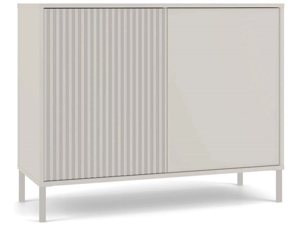 Komoda KAMARO 2D SLIM v barvě kašmír přináší jedinečný vzhled díky kombinaci dvou typů dvířek – jedno hladké a jedno s jemným ryflováním (18mm MDF) ve stylu lamel. Tato vizuální hra textur dodává nábytku osobitý charakter, který se skvěle hodí do moderních i útulných interiérů.Otevírání pomocí bezúchytového systému TIP-ON zajišťuje pohodlné používání – dvířka se otevřou jemným stiskem. Uvnitř komody se nachází čtyři praktické police, které nabídnou dostatek úložného prostoru pro obývací pokoj, pracovnu nebo ložnici. Kovové nožky vysoké 13,5 cm působí vzdušně a zároveň zajišťují stabilitu nábytku.