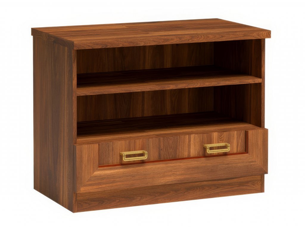 Komoda ze sektorové řady. Komoda má 1 praktickou zásuvku. Systém je exkluzivní kolekce navržena v duchu vintage. Celá řada se vyznačuje elegancí a jednoduchými tvary, které zaručují plné využití prostoru. Nábytek je vyroben z velmi kvalitní LTD o tloušťce 16 mm, horní deska zesílena na 32 mm, lišty na čele nábytku jsou MDF, hrany ABS. Tvrzené sklo ve vitrínách je jemně zdobené. Elegantní úchyty jsou z kovu. Barevné provedení dub stoletý. Dodáváme v demontovaném stavu.Doplňkové parametry