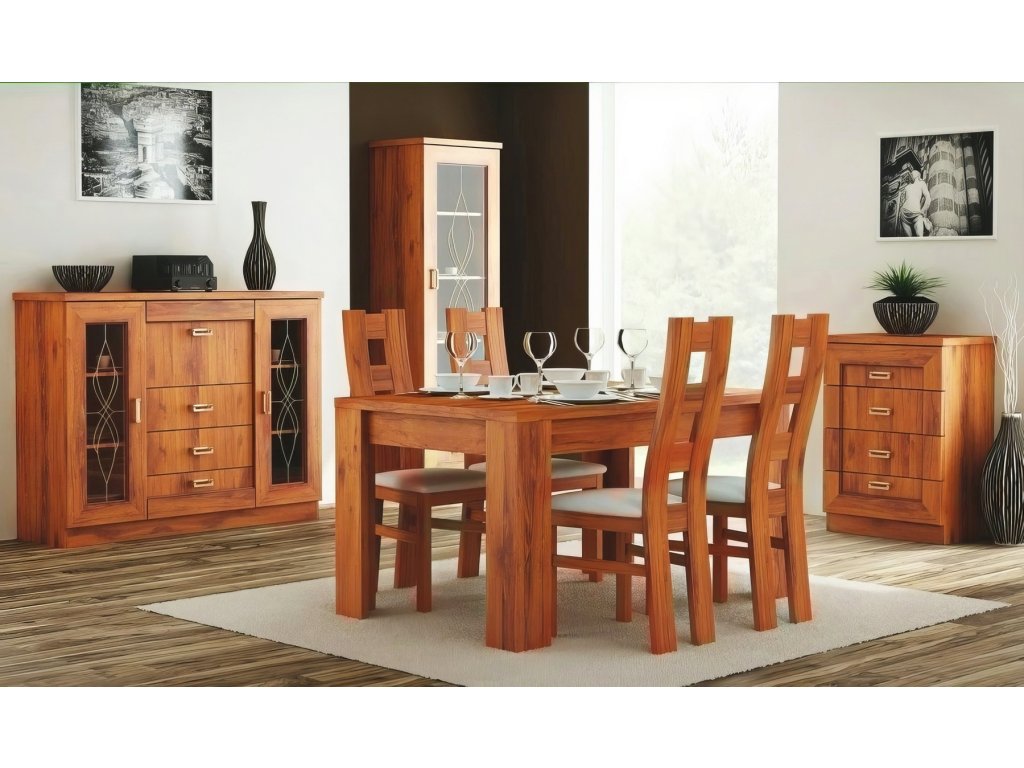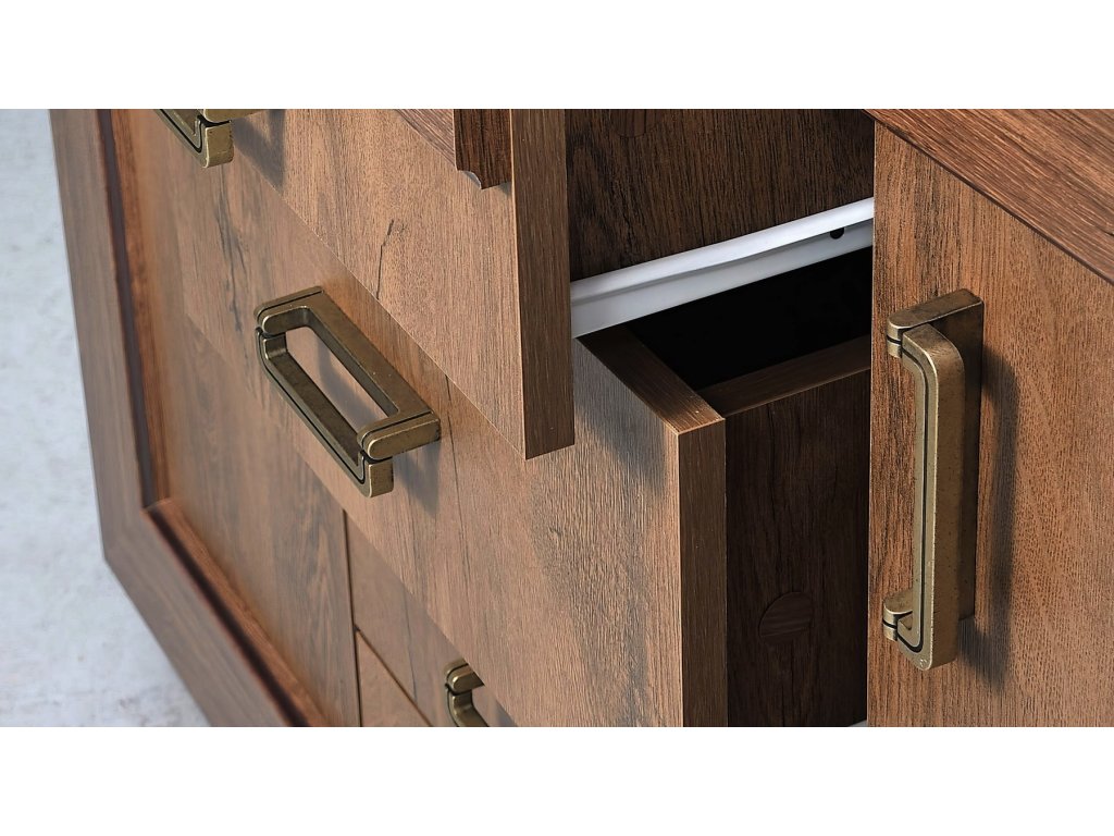Komoda ze sektorové řady. Komoda má 4 praktické zásuvky. Systém je exkluzivní kolekce navržena v duchu vintage. Celá řada se vyznačuje elegancí a jednoduchými tvary, které zaručují plné využití prostoru. Nábytek je vyroben z velmi kvalitní LTD o tloušťce 16 mm, horní deska zesílena na 32 mm, lišty na čele nábytku jsou MDF, hrany ABS. Tvrzené sklo ve vitrínách je jemně zdobené. Elegantní úchyty jsou z kovu. Barevné provedení dub stoletý. Dodáváme v demontovaném stavu.Doplňkové parametry