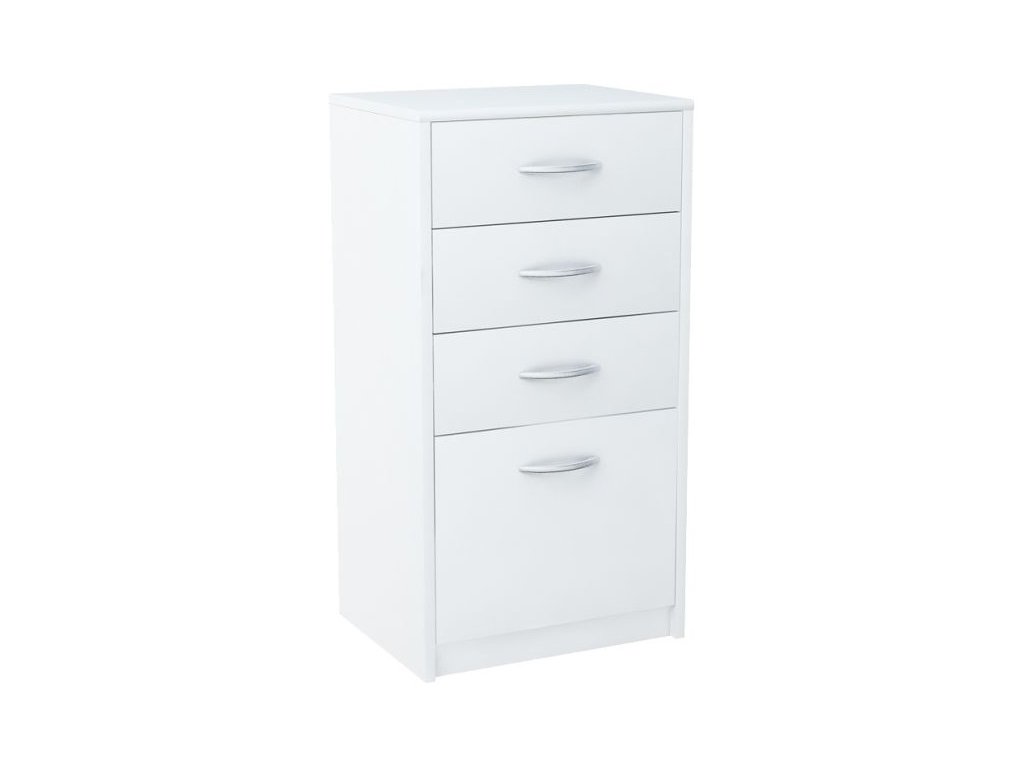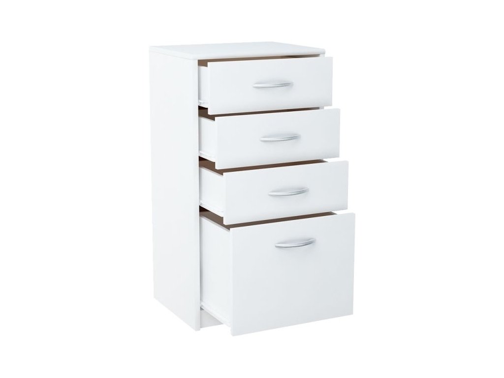 Komoda se 4 zásuvkami v moderním provedení. Korpus i čela zásuvek jsou z kvalitní LTD v barvě bílé. Lamino je odolné vůči vysokým teplotám, poškrábání a nárazům, hraněné ABS páskou. Jasně viditelná struktura dřeva. Pojezdy v zásuvkách jsou kovové s plastovými kolečky. Dodáváme v demontovaném stavu.Doplňkové parametry