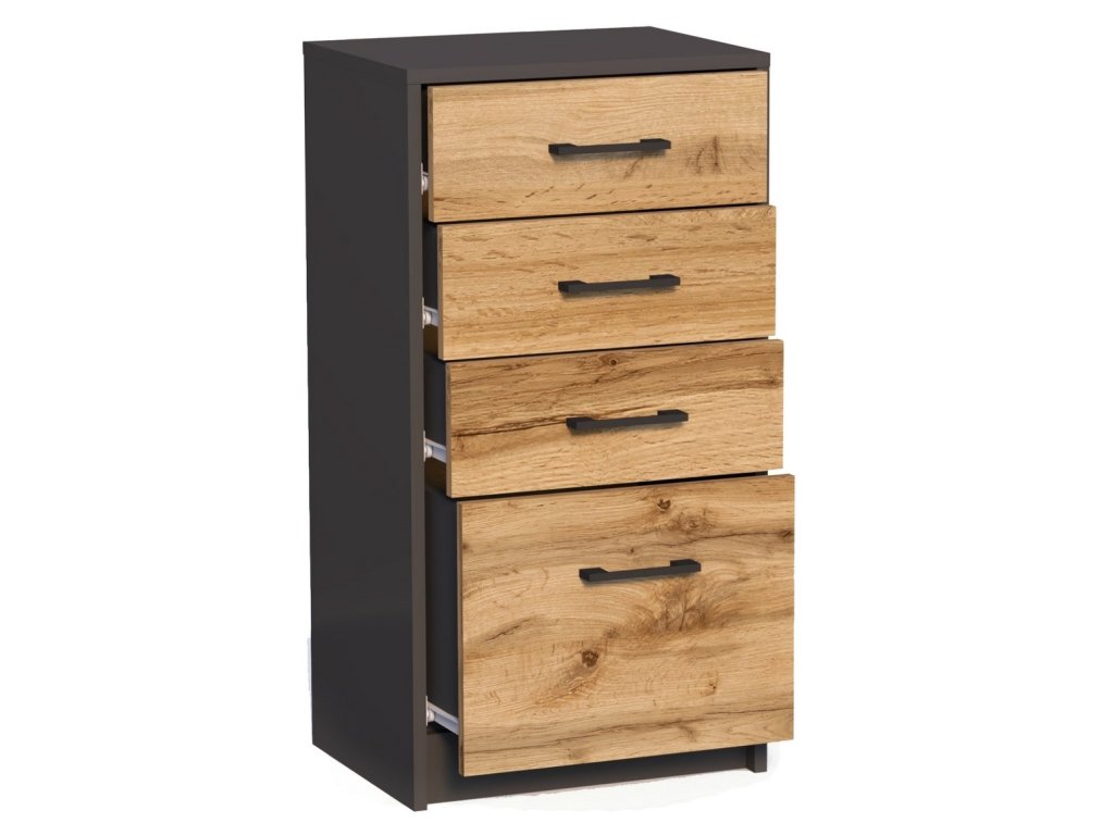 Komoda se 4 zásuvkami v moderním provedení. Korpus i čela zásuvek jsou z kvalitní LTD v barevné kombinaci grafit/dub wotan. Lamino je odolné vůči vysokým teplotám, poškrábání a nárazům, hraněné ABS páskou. Jasně viditelná struktura dřeva. Pojezdy v zásuvkách jsou kovové s plastovými kolečky. Dodáváme v demontovaném stavu.Doplňkové parametry