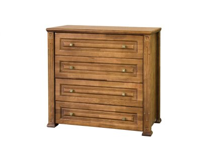 šířka: 95 cm | výška: 92 cm | hloubka: 47 cm Komoda se čtyřmi zásuvkami je vyrobena z masivního dubového dřeva s vyřezávaným dekorem v barevném provedení ořech. Úchyty jsou...