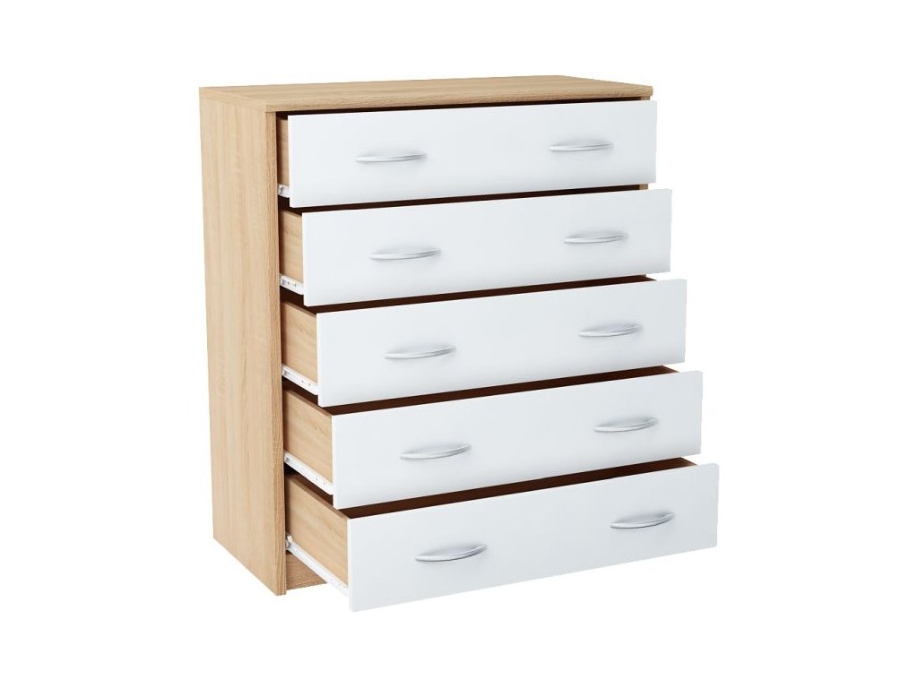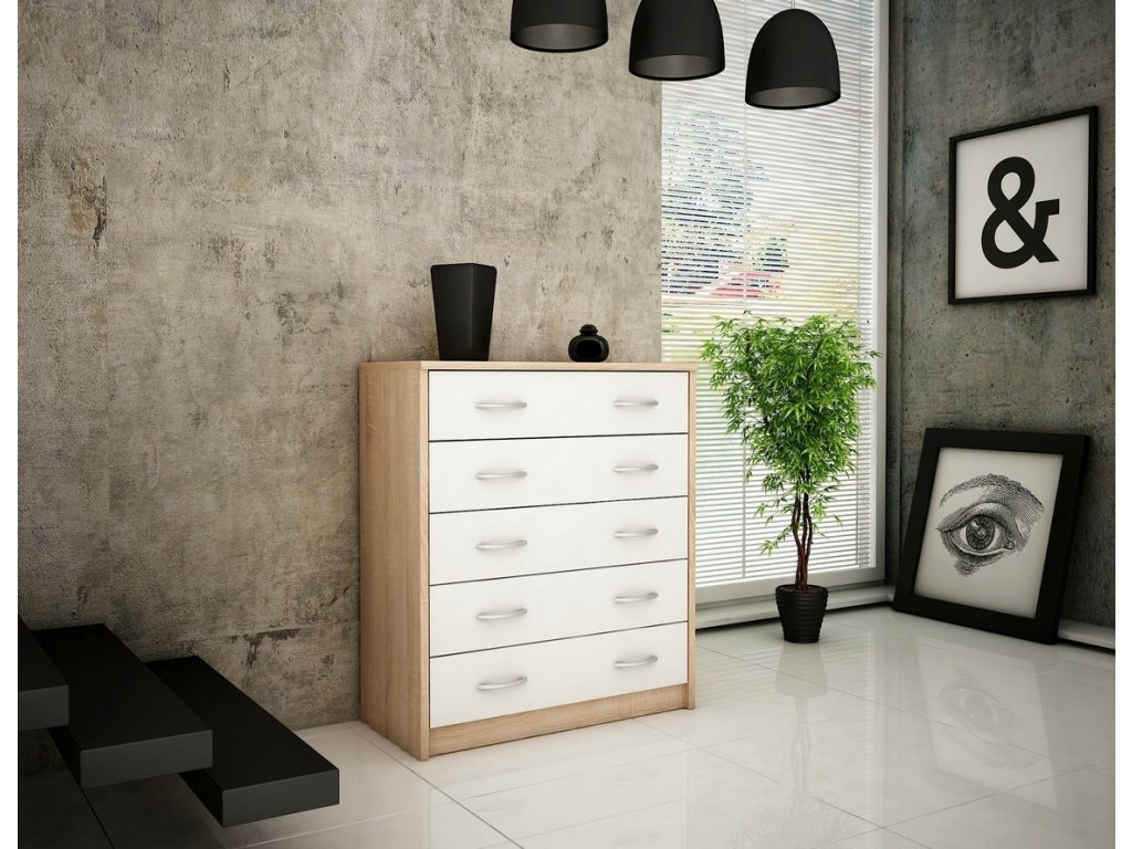 Komoda s 5 zásuvkami v moderním provedení. Korpus i dvířka jsou z kvalitní LTD, korpus v barvě dub sonoma a dvířka v barvě bílá. Lamino je odolné vůči vysokým teplotám, poškrábání a nárazům, hraněné ABS páskou. Jasně viditelná struktura dřeva. Pojezdy v zásuvkách jsou kovové s plastovými kolečky. Dodáváme v demontovaném stavu.Doplňkové parametry