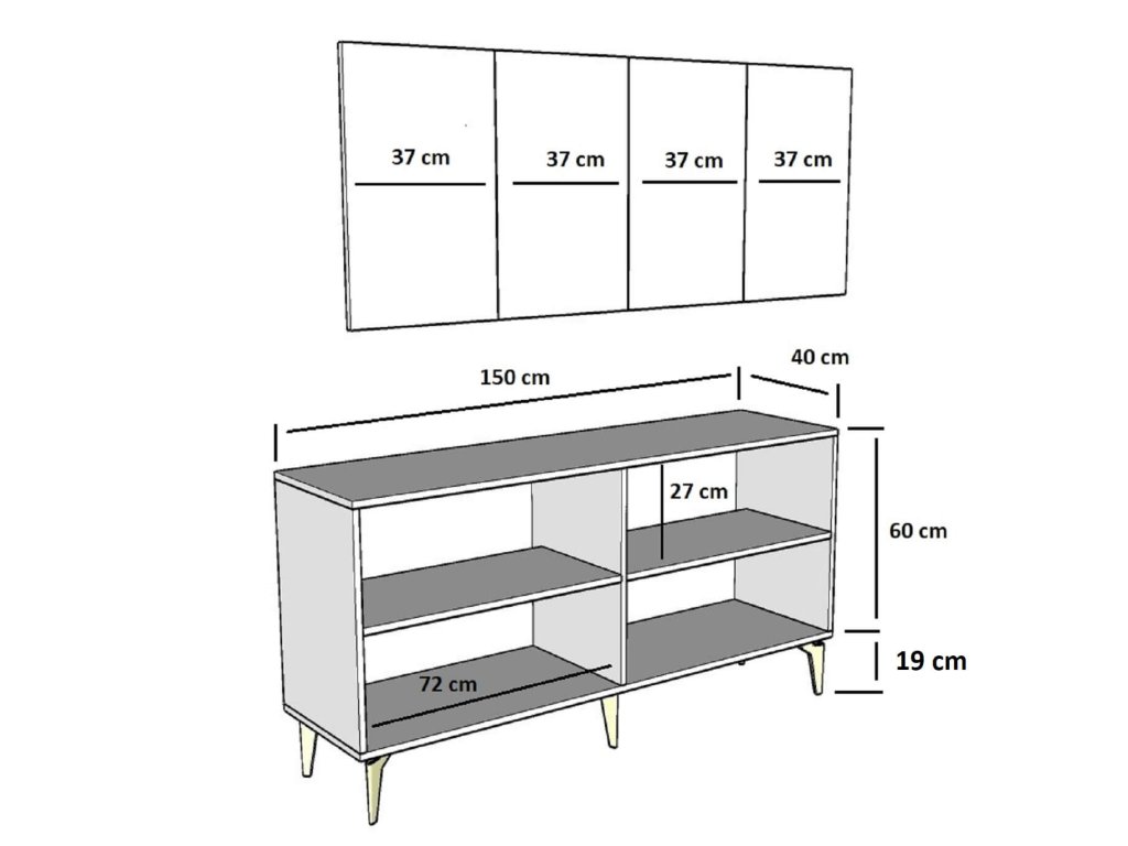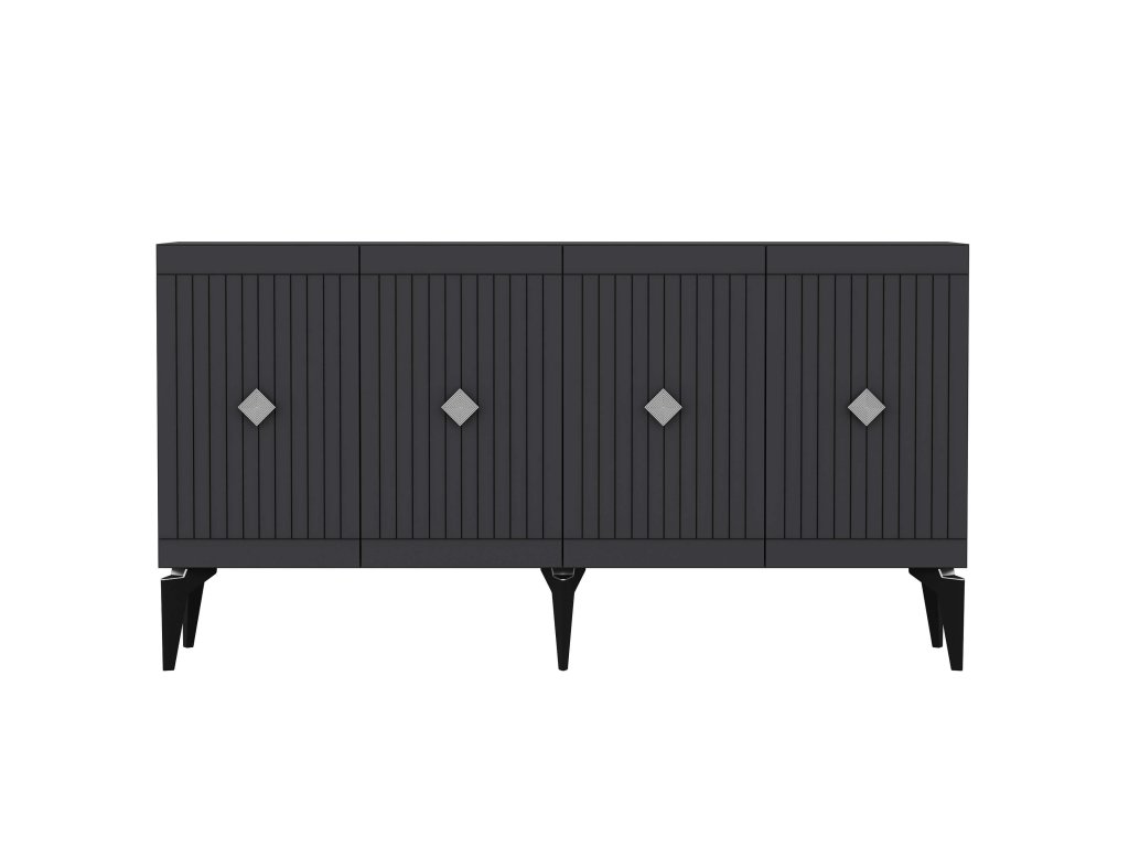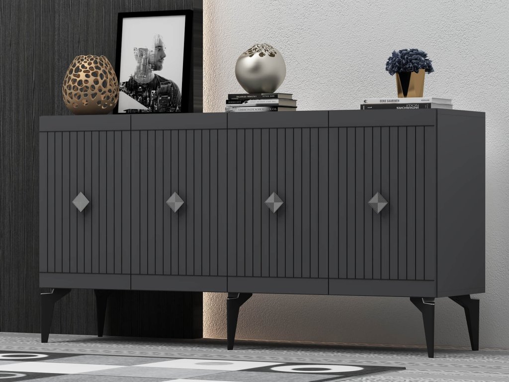 Komod je ideálním doplňkem pro každý moderní obývací pokoj. Její široký design a elegantní kombinace antracitové a zlaté barvy dodávají interiéru luxusní vzhled. S čtyřmi plnými dvířky nabízí dostatek úložného prostoru pro všechny vaše potřeby, ať už jde o knihy, dekorace nebo jiné předměty.
