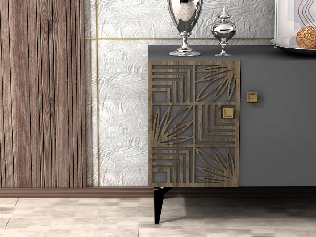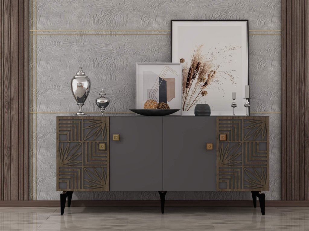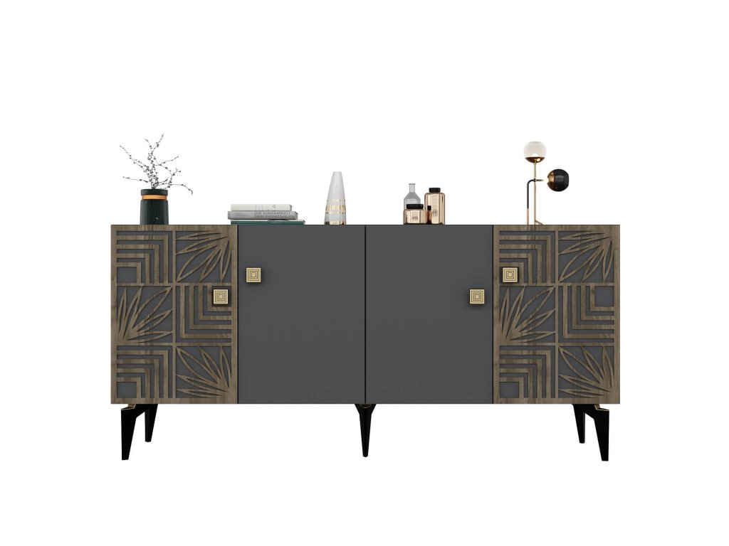 Komoda přináší do vašeho obývacího pokoje kombinaci luxusu a funkčnosti. Její široký design s čtyřmi plnými dvířky nabízí dostatek úložného prostoru pro všechny vaše potřeby, od knih a dekorací až po další předměty, které chcete mít elegantně uspořádané.