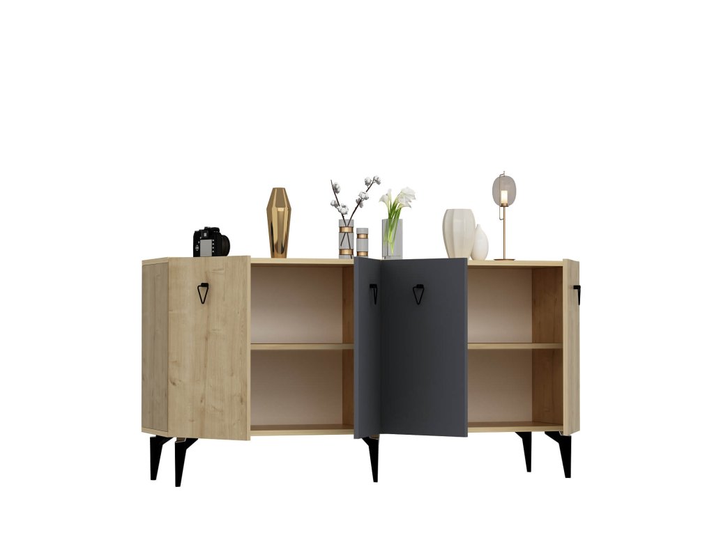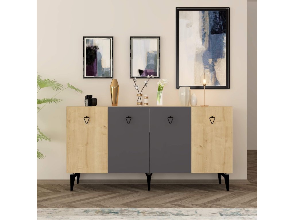 Komoda je ideálním doplňkem pro moderní obývací pokoj, který kombinuje praktičnost s elegantním designem. Díky čtyřem plným dvířkům nabízí dostatek úložného prostoru pro všechny vaše potřeby, ať už jde o knihy, dekorace nebo jiné předměty. Kombinace antracitové a bílé barvy dodává interiéru stylový a sofistikovaný vzhled.
