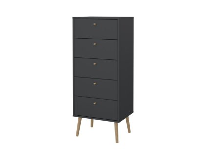 Komoda s 5 zásuvkami v moderním provedení. Korpus i dvířka jsou z kvalitní LTD v barvě dub sonoma. Lamino je odolné vůči vysokým teplotám, poškrábání a nárazům, hraněné ABS páskou. Jasně viditelná struktura dřeva. Pojezdy v zásuvkách jsou kovové s plastovými kolečky. Dodáváme v demontovaném stavu.