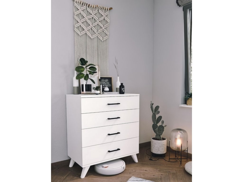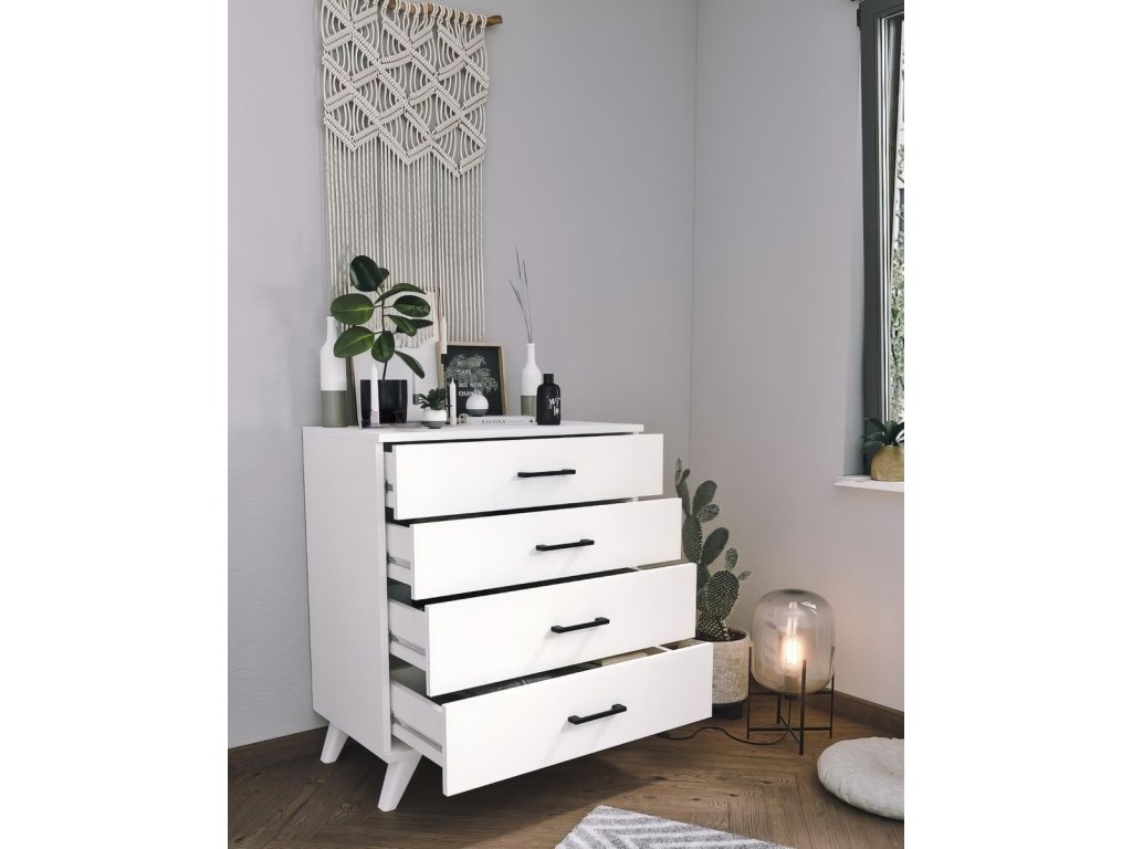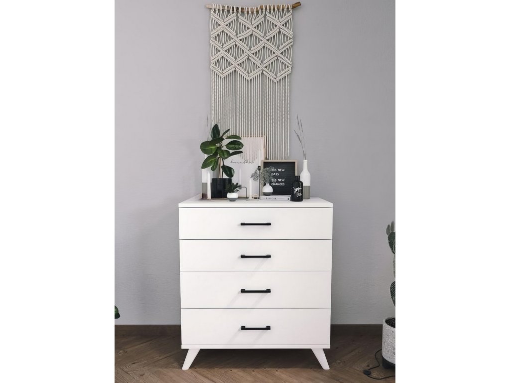 Komoda se čtyřmi zásuvkami je vyrobena z kvalitní desky LTD tl. 18 mm v barevném provedení bílá. Komoda je na nožkách vysokých 12 cm. Dodáváme v demontovaném stavu.