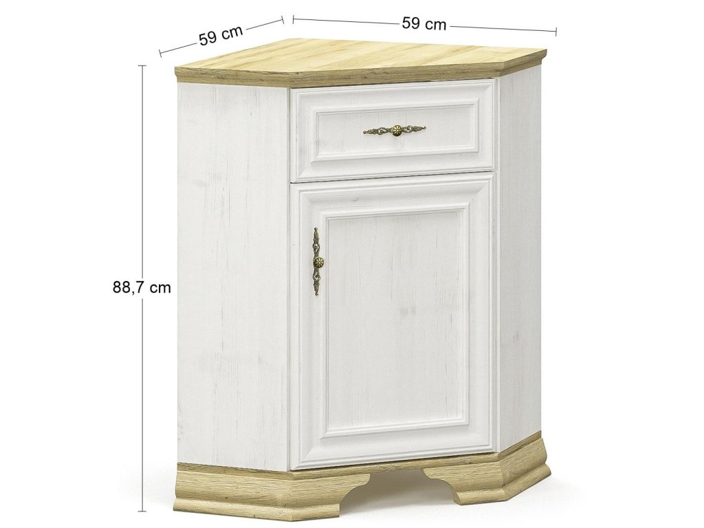 Komoda rohová jednodveřová se zásuvkou ze sektorové řady nábytku v romantickém stylu. Nábytek je vyroben z kvalitní LTD v kombinaci s MDF v barevné kombinaci borovice andersen/zlatý dub. V naší nabídce najdete další jednotlivé prvky tohoto nábytku, ze kterého si můžete zařídit obývací pokoj dle vlastních potřeb. Dodáváme v demontovaném stavu.