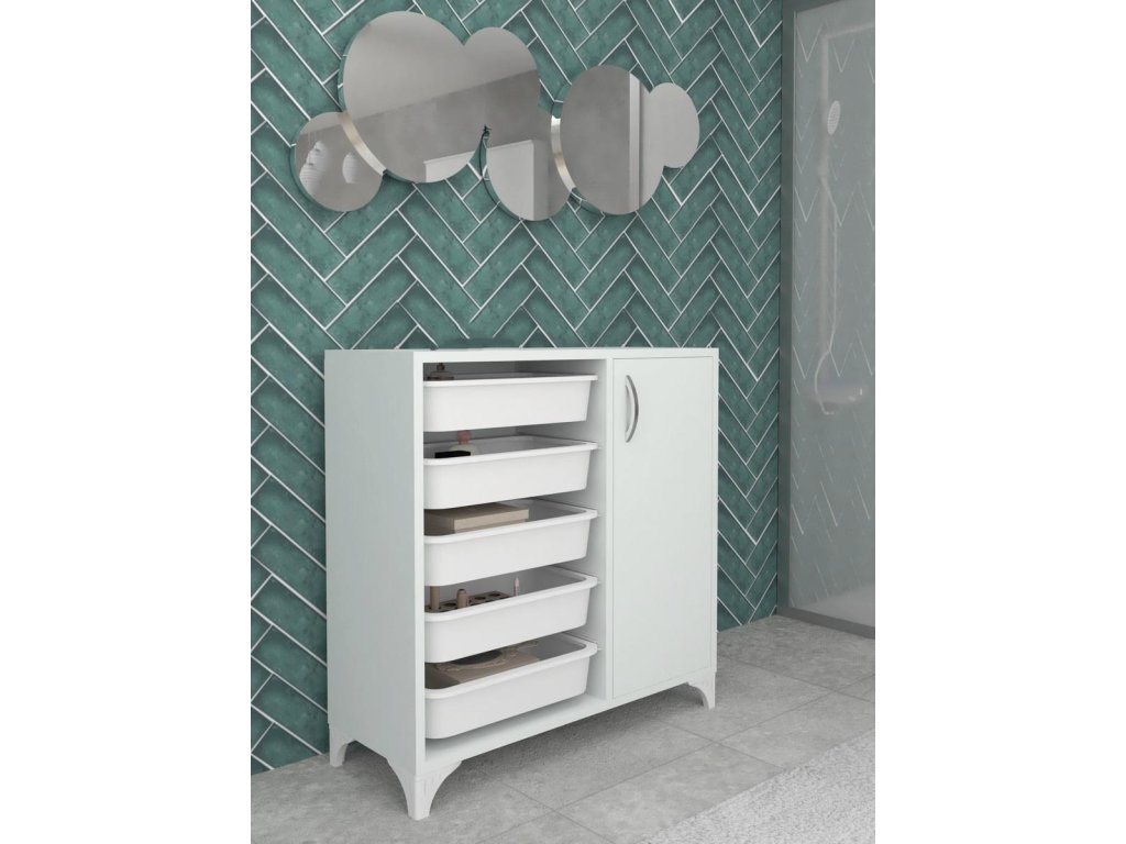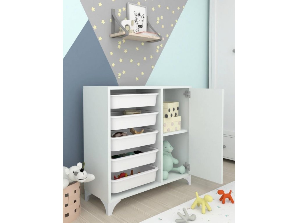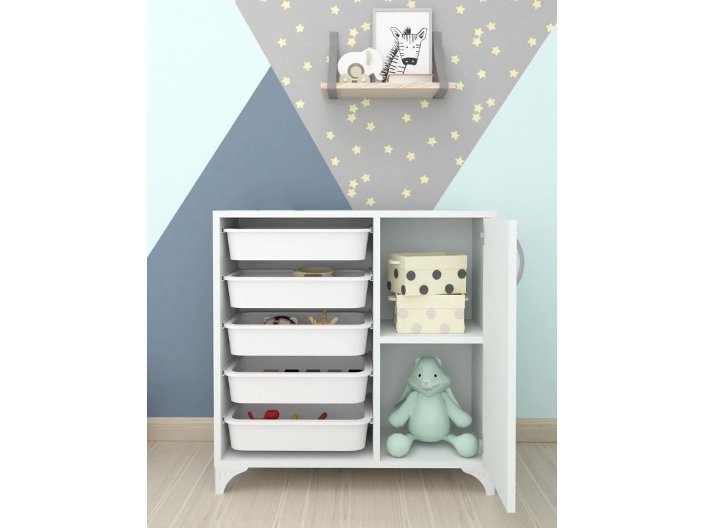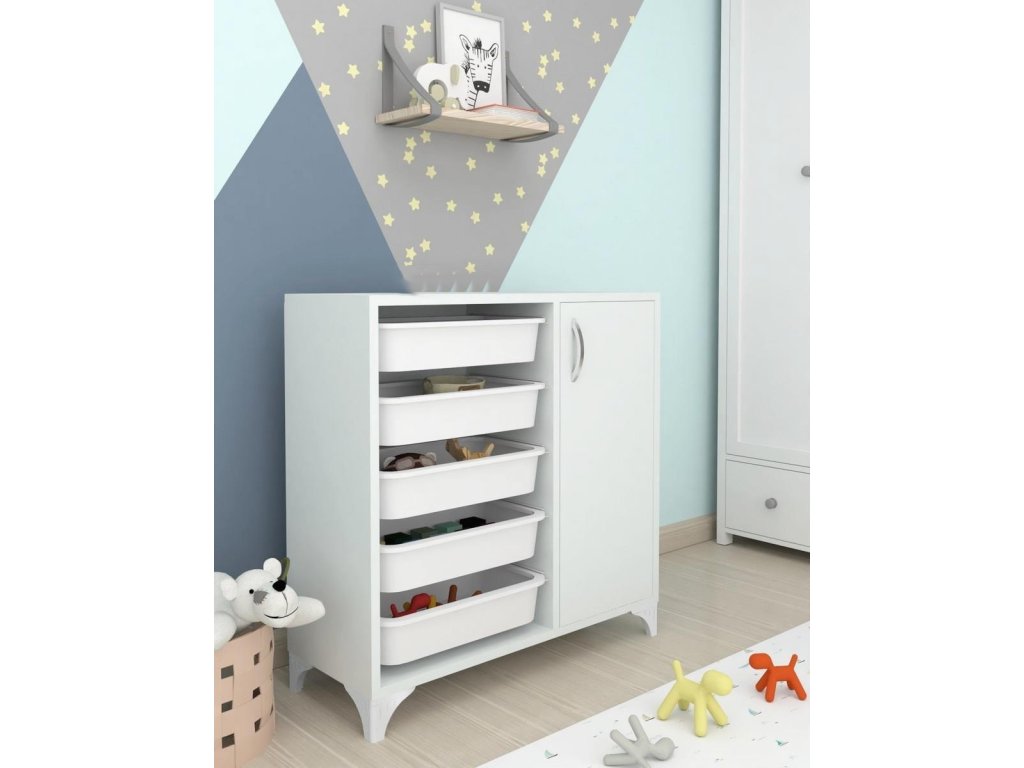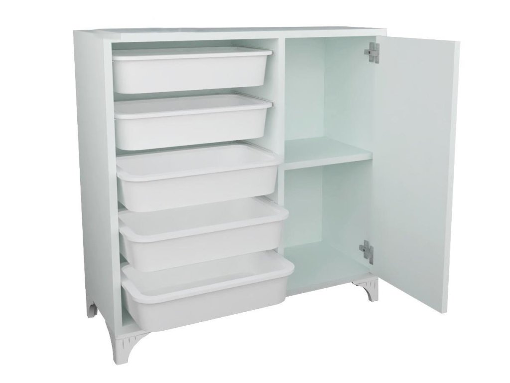 Multifunkční skříňka jednodveřová s pěti plastovými zásuvkami je vyrobena z kvalitní LTD desky v barvě matná bílá. Dodáváme v demontovaném stavu.