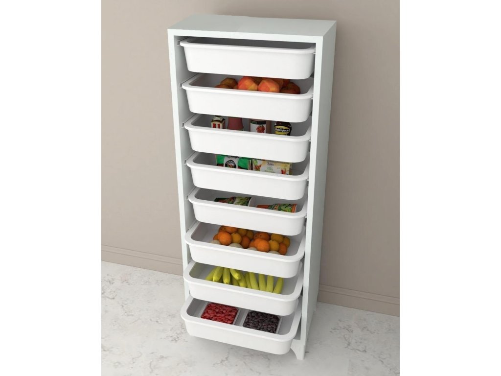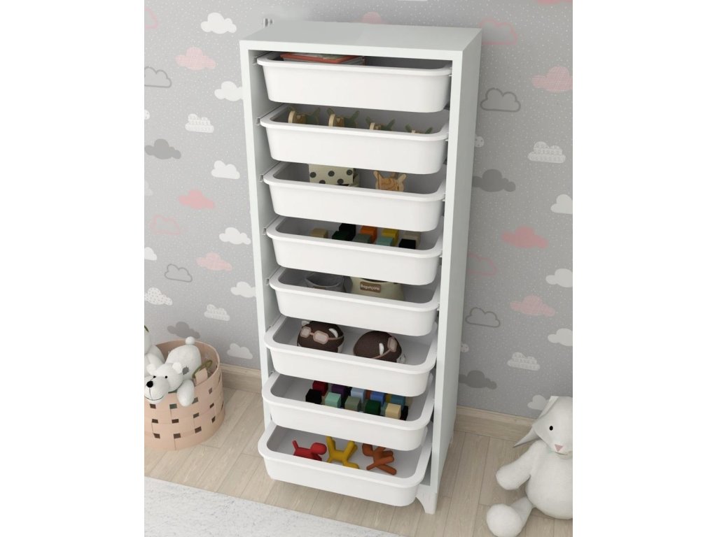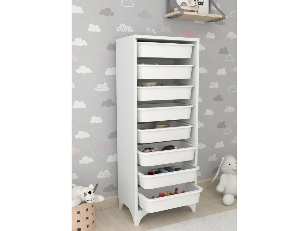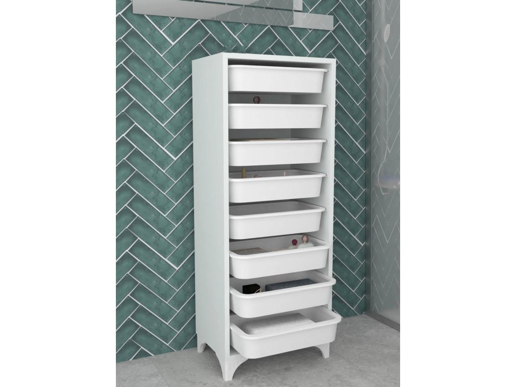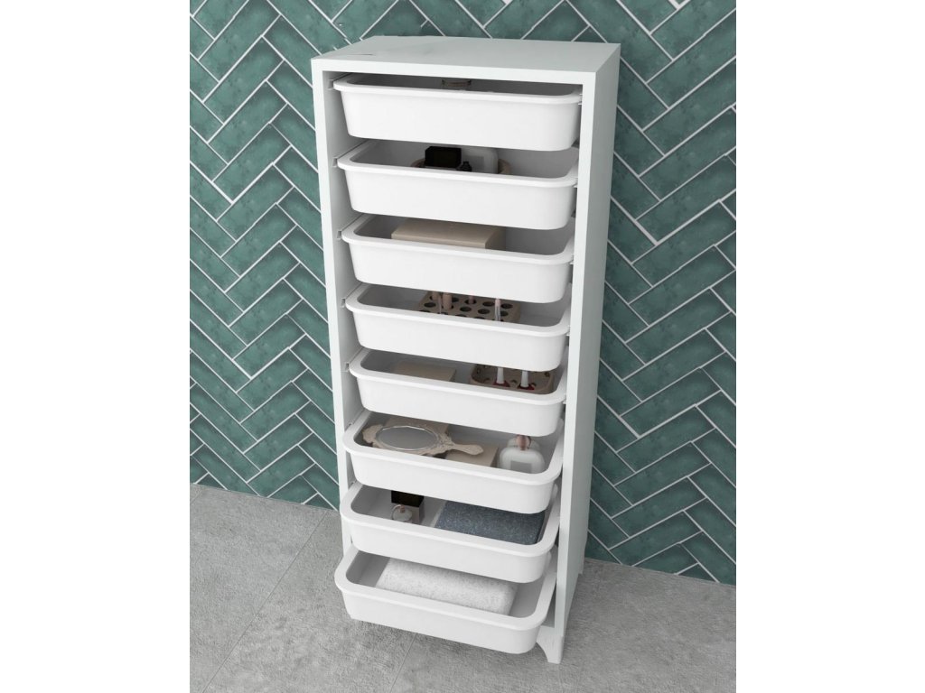 Multifunkční skříňka s osmi plastovými zásuvkami je vyrobena z kvalitní LTD desky v barvě matná bílá. Dodáváme v demontovaném stavu.
